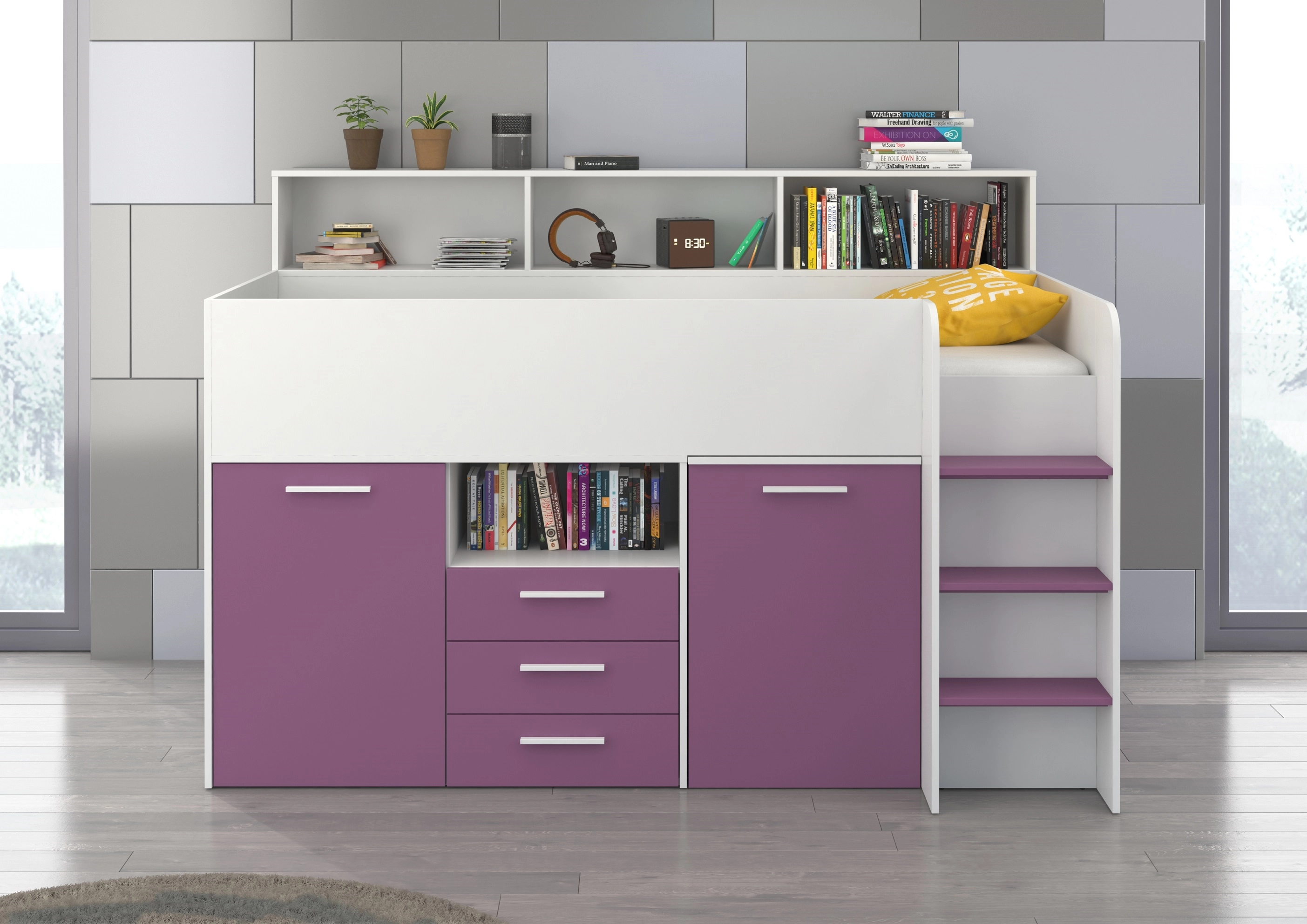 Postel je šikovným řešením do malých interiérů. Předností postele je spací prostor a zároveň dostatek úložného prostoru, aniž by zabírala mnoho místa v pokoji. Chytře navržený vysouvací psací stůl splní nároky vašeho školáka, ale nebude zabírat místo při hraní, protože jej můžete snadno zasunout pod postel. Matrace není součástí postele, doporučený rozměr je 80x200 cm a maximální výška 12 cm. Součástí lůžka je pevná deska, nemusíte tedy objednávat rošt. Barva: - bílá/levandulová - úchytky: stříbrná Rozměr (šxvxh): 206 x 138 x 120 cm Ložná plocha (hxš): 80 x 200 cm Materiál: lamino o síle 16 mm s ABS hranami - úchytky: tvrzený plast Nosnost: max. 90 kg