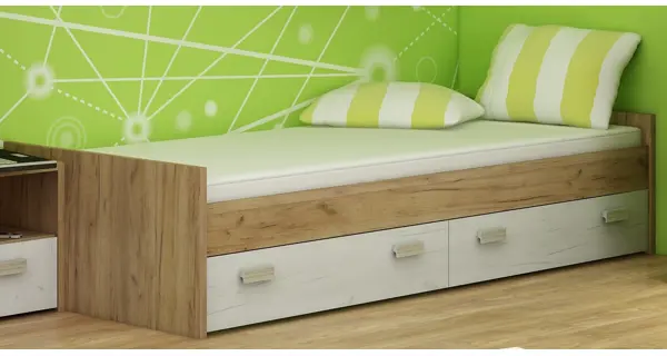 Postel nízká 90x200 cm Barva: craft zlatý/craft bílý Materiál: korpus - lamino 25 mm, dvířka - lamino 16 mm, ABS hrana 0,6 mm Úchytky jsou vyrobeny z tvrzeného PVC. Rozměry (šxvxhl): 206 x 50