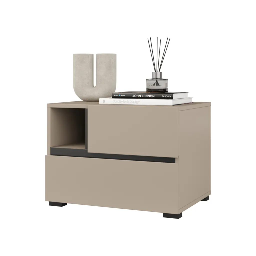 Noční stolek se zásuvkami - bezúchytový systém Rozměry (šířka x výška x hloubka): 55 x 40 x 40 cm Materiál: lamino Barva: congo/černá Dodáváno v demontu.