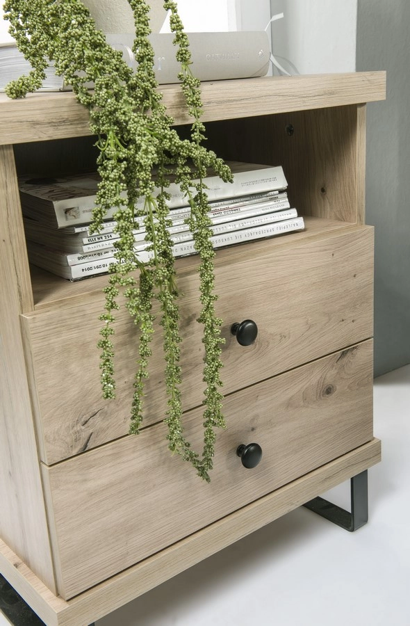 Noční stolek ze sektorové řady. Noční stolek se dvěma zásuvkami. Barva: dub artisan/černá Materiál: kvalitní lamino s ABS hranami/lamely jsou vyrobeny z desky MDF Rozměry (šxvxh): 48 x 51 x 40,6 cm Dodáváno v demontu