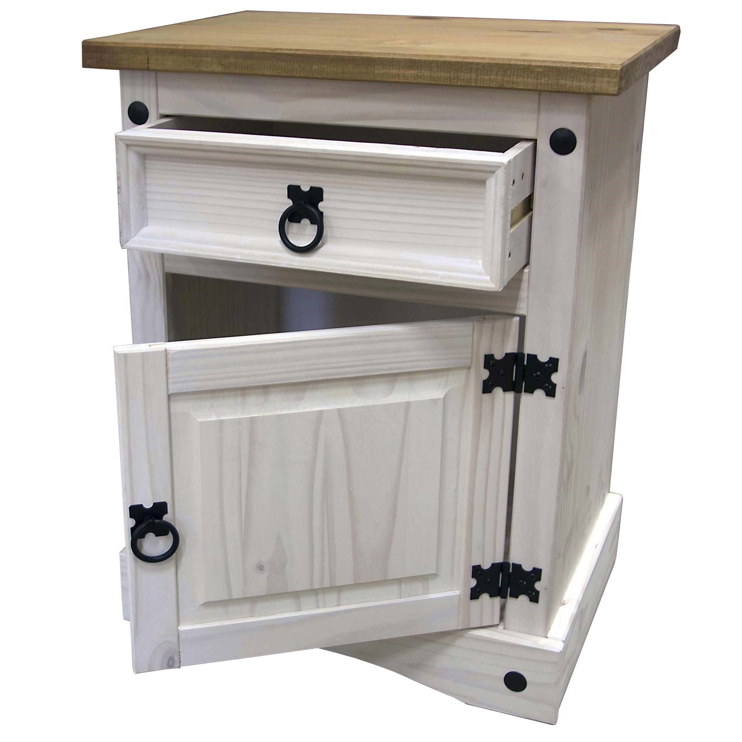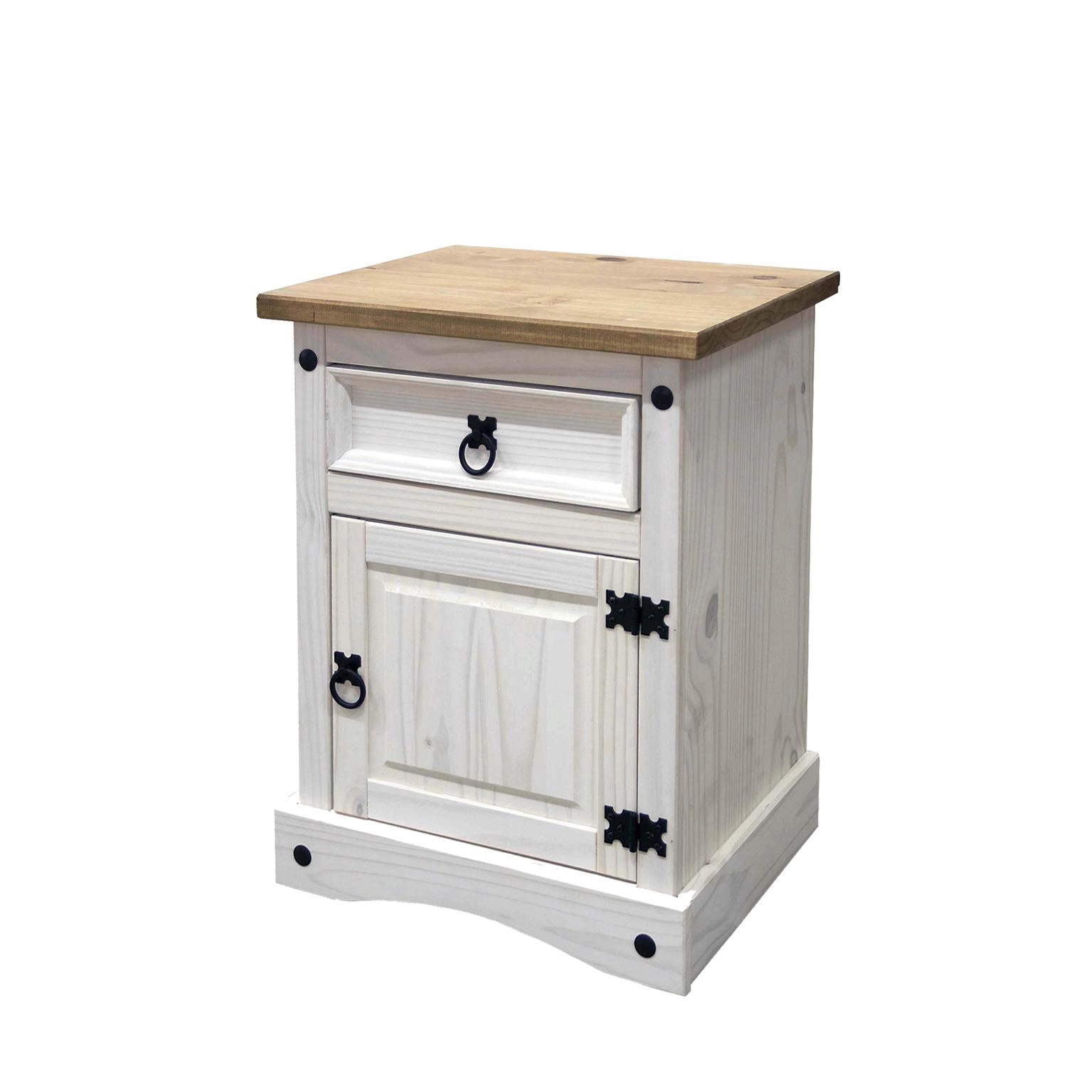 Noční stolek z masivu Materiál: masiv borovice, povrchová úprava - voskované v bílém odstínu; horní deska masiv borovice voskovaná v medovém odstínu, ostatní části voskované v bílém odstínu; 1 zásuvka