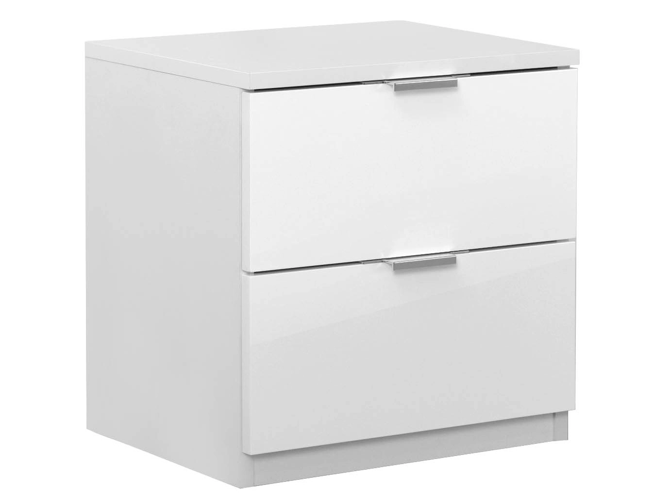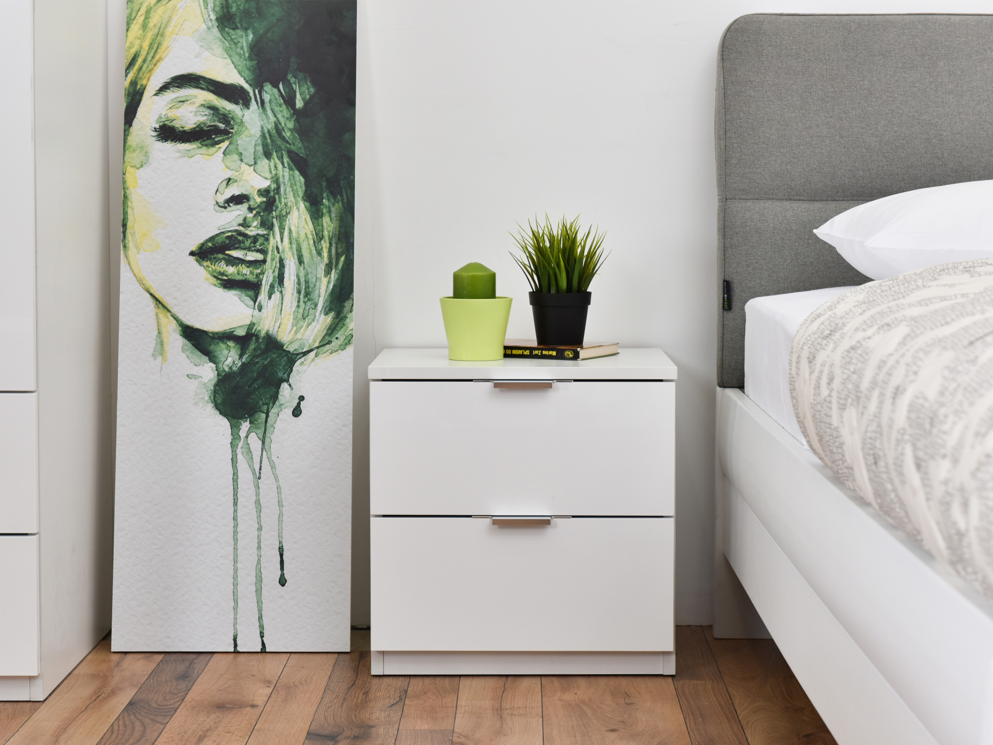 Noční stolky 2F jsou vyrobeny lamina zakončeného ABS hranou. Obsahují 2 zásuvky na kovových jezdcích a s kovovými držadly.