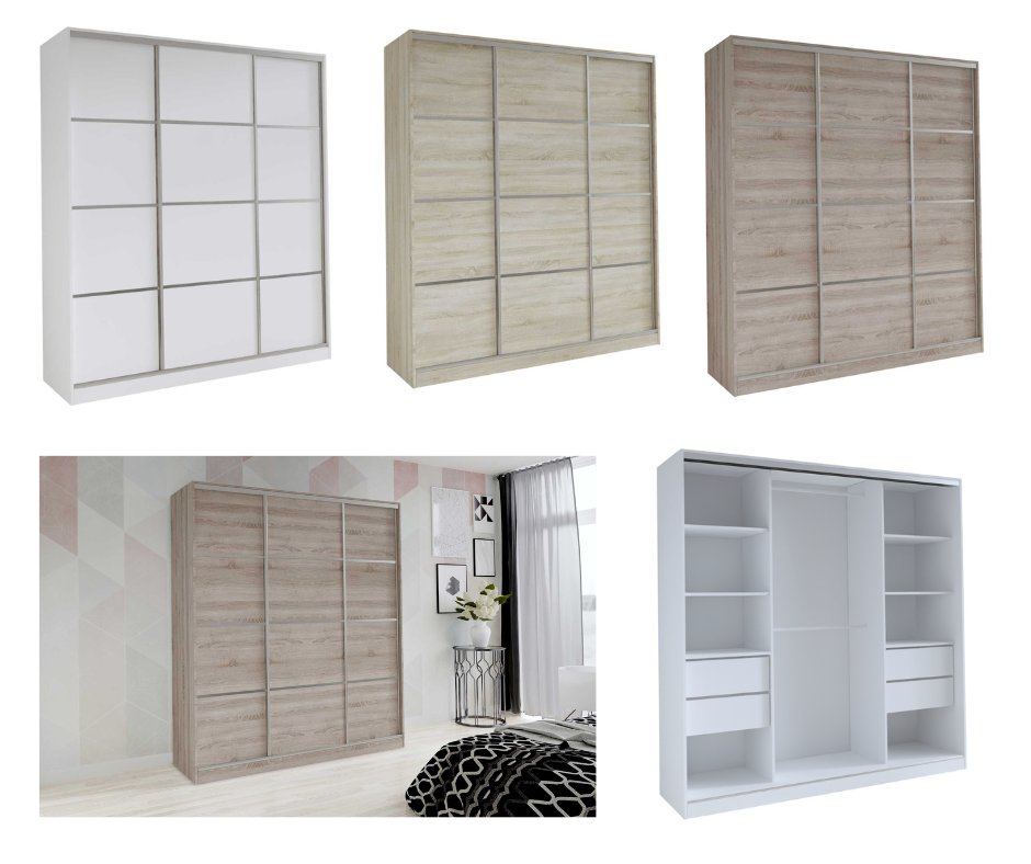 Barevné možnosti jsou totožné jako u variant výše. Jen prostřední posuvné dveře jsou navíc opatřeny i zrcadlem přes jejich celou délku. Skvěle tak můžete zkontrolovat svůj vybraný model před tím, než odejdete do práce. Velké, prostorné a navíc s praktickým zrcadlem uprostřed. Troje posuvné dveře ukrývají dostatek úložného prostoru se 6 policemi, 4 zásuvkami a 2 tyčemi. Se šířkou skříně až 280 cm se rozhodně nemusíte bát o nedostatek místa. Lesklá bílá, dub a beton jsou odstíny moderní a svěží, které vám místnost krásně rozzáří.