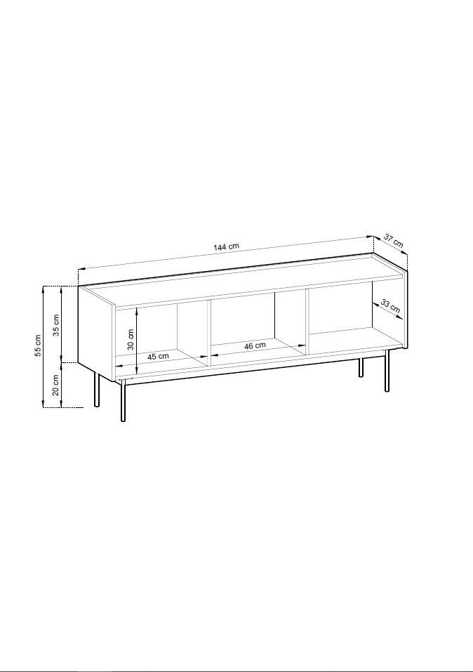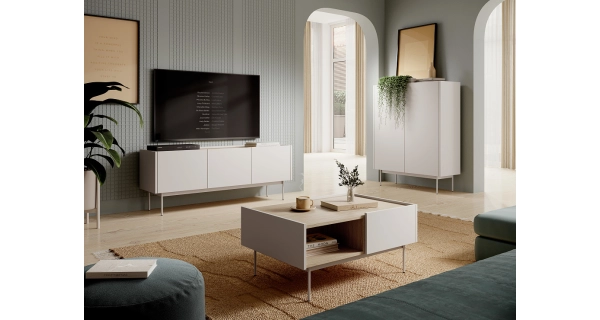 Vzorová sestava obývacího pokoje. Jednotlivé prvky je možno zakoupit zvláště a sestavit si tak pokoj dle svých představ a požadavků. Materiál: lamino Barva: kašmír/dub linea Sestava se skládá z následujících prvků: - televizní stolek (šxvxh): 144 x 55 x 37 cm - konferenční stolek (šxvxh): 97 x 45 x 65 cm - komoda 2D (šxvxh): 97 x 122 x 37 cm Dodáváno v demontu.