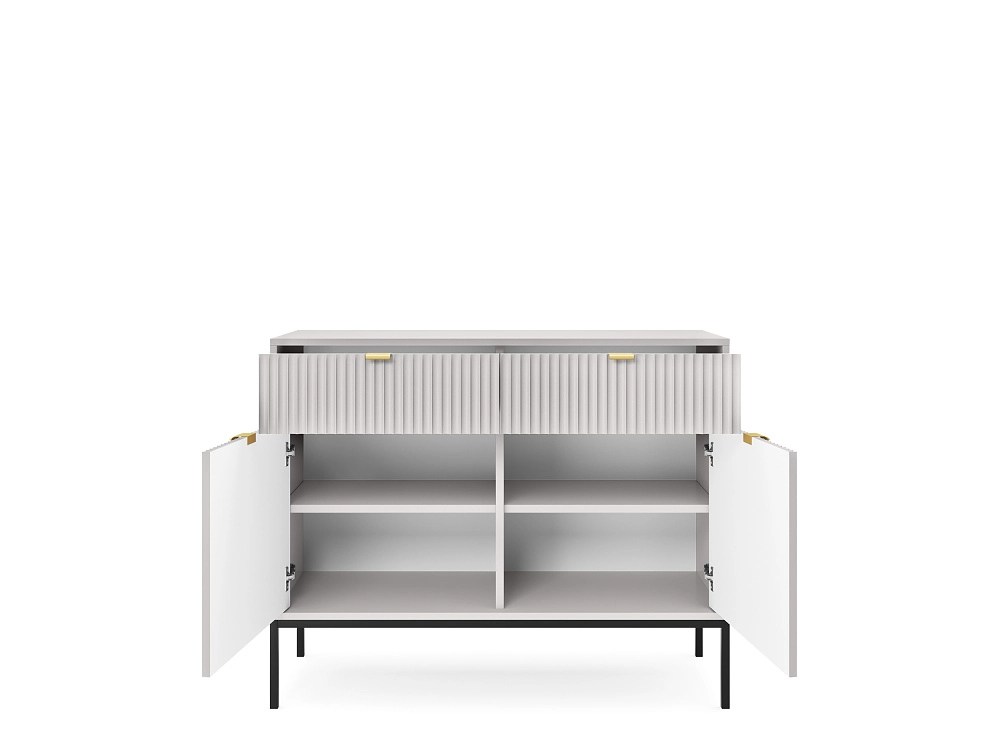 Materiál: - korpus: lamino tl. 16 mm s ABS hranou 0,5 mm - přední strany: drážkované lamino tl. 18 mm Úchyt: broušený zlatý hliník Nohy: práškovaná ocel 18 x 18 mm
