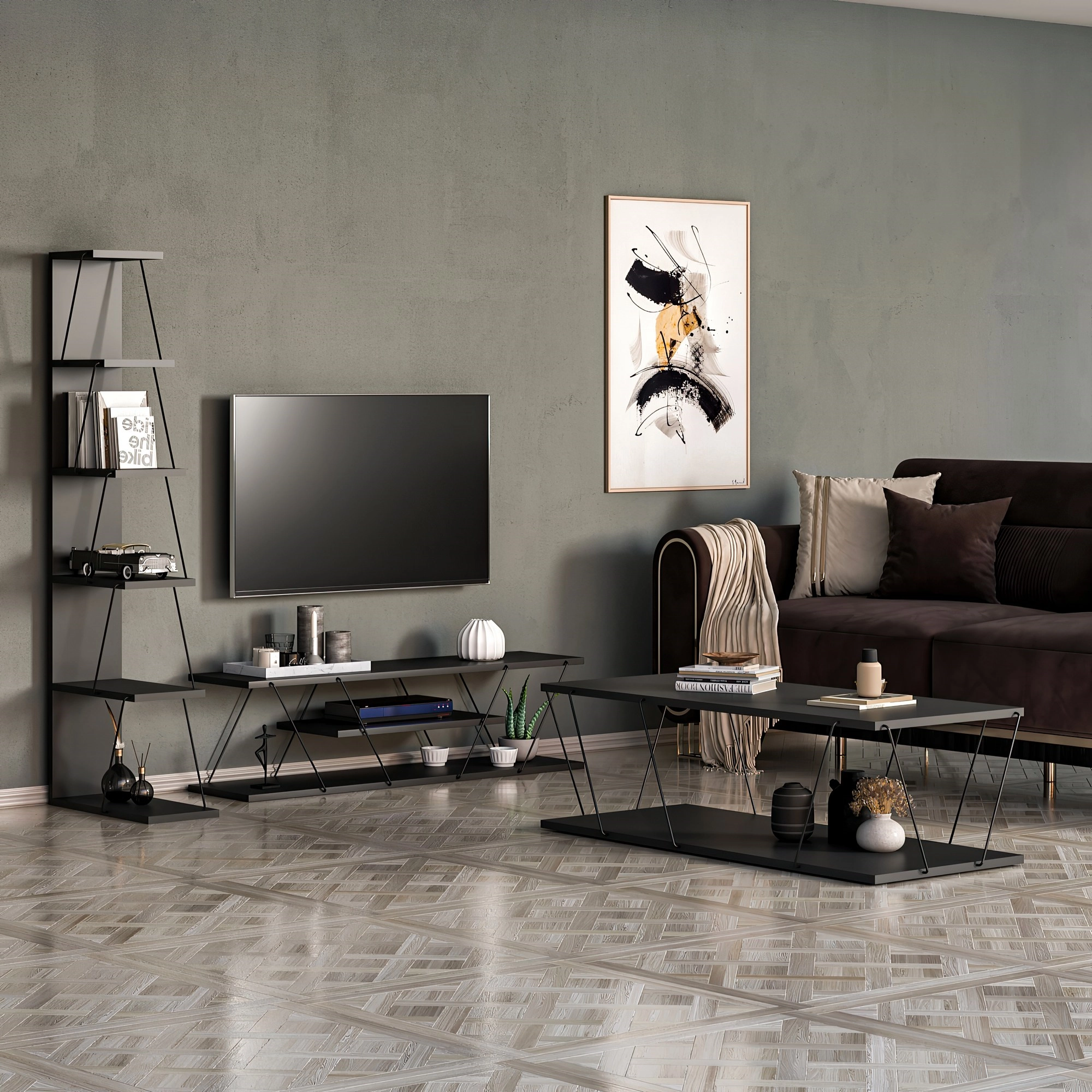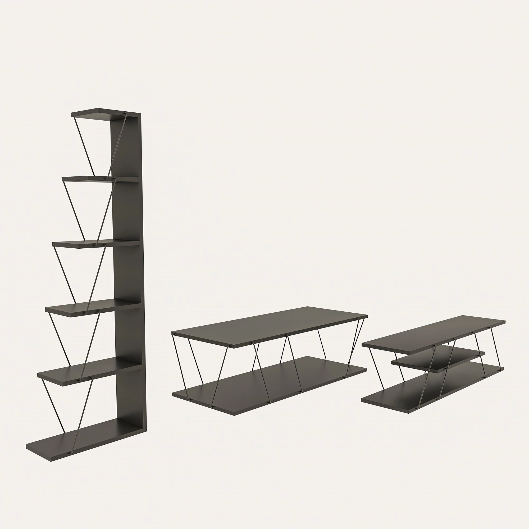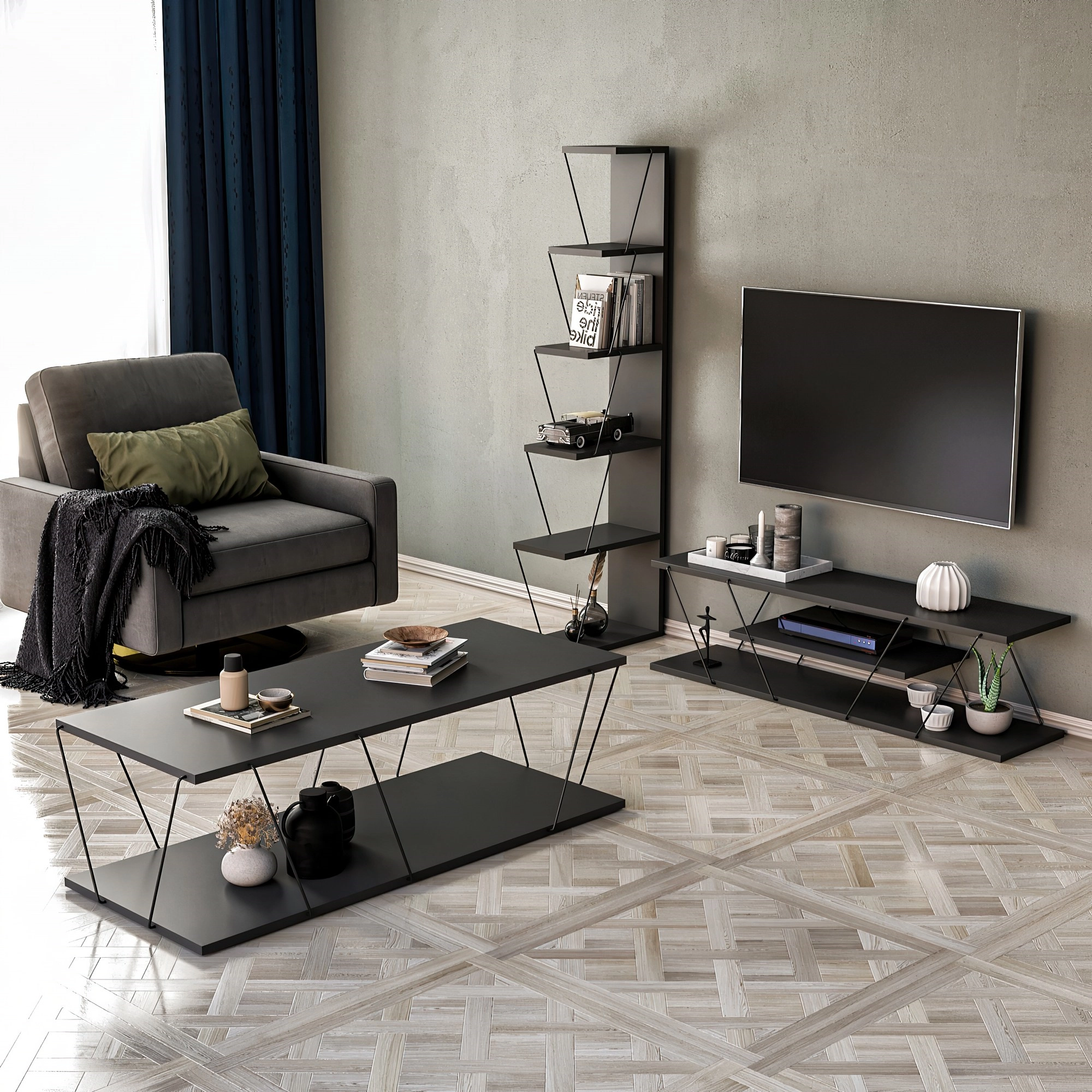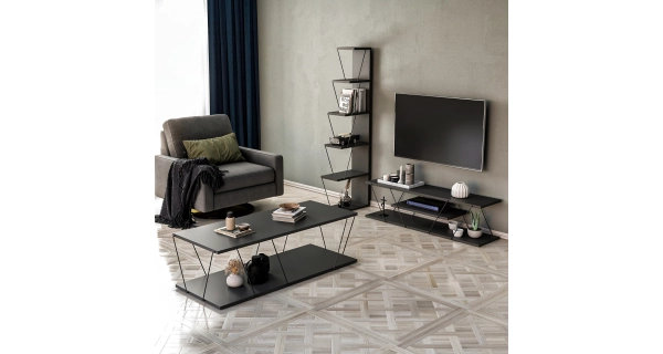 Proměňte svůj obývací pokoj ve stylové a útulné útočiště s naší sadou nábytku do obývacího pokoje. Tato sestava je vyrobena ze 100% melaminovaných dřevotřískových desek a robustního kovového rámu a vydrží dlouho. Elegantní design a elegantní barevná kombinace antracitové a černé barvy okamžitě pozvednou vzhled každého prostoru.
