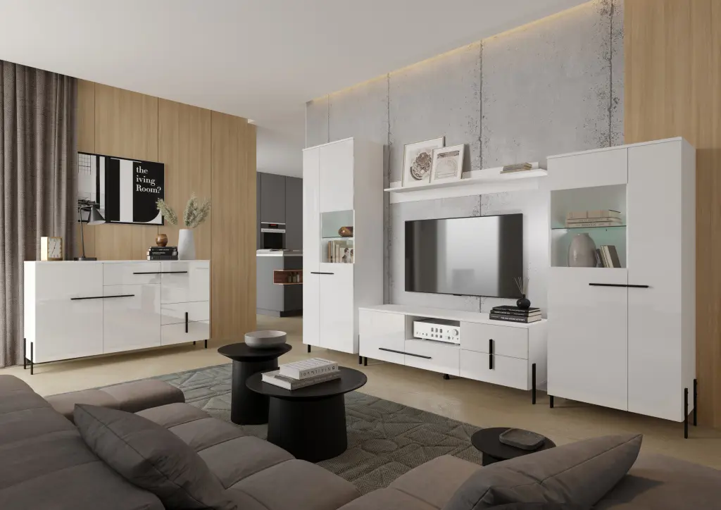 Barva: korpus - bílá, dvířka - bílý lesk, úchyt - černá, nožky - černá