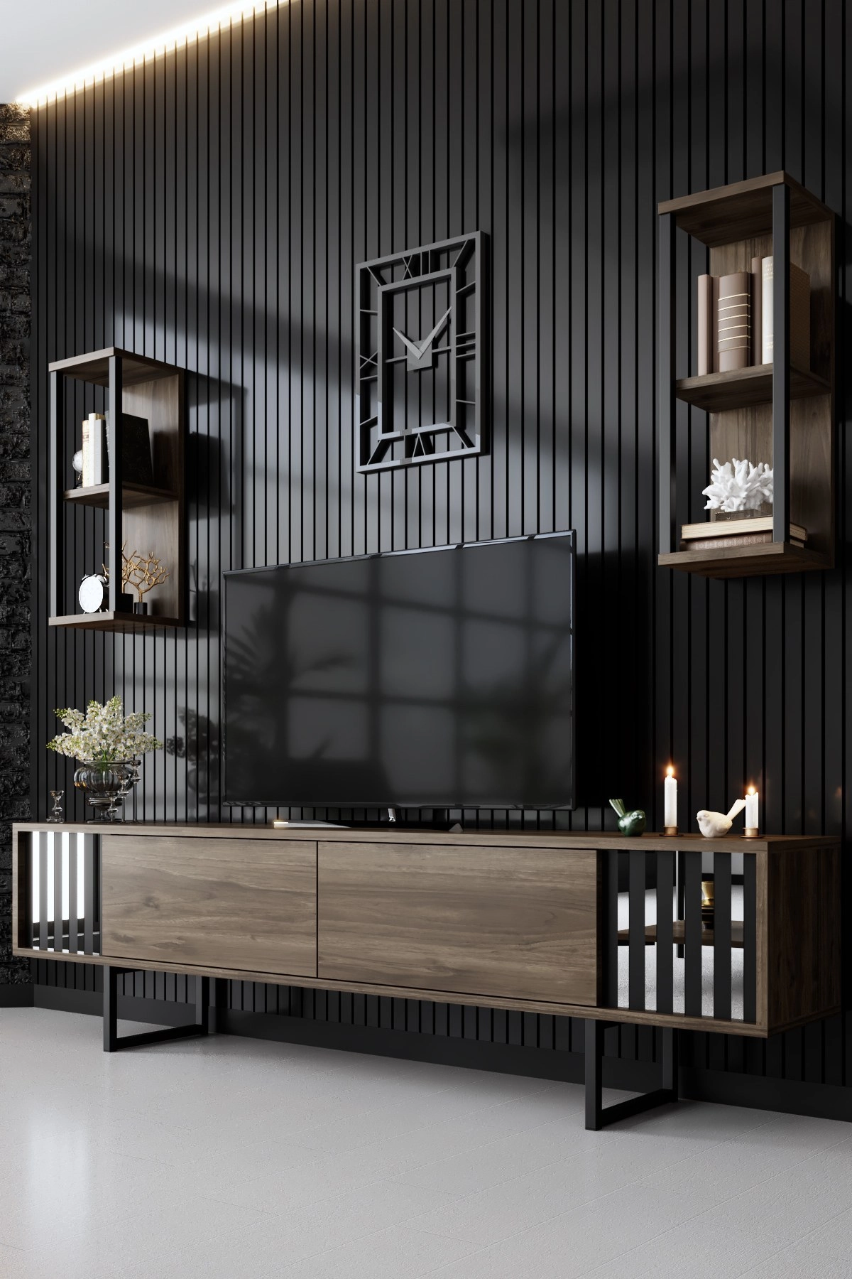 Televizní stolek s velkorysými rozměry 180 cm na šířku, 30 cm do hloubky a 48 cm na výšku poskytuje dostatek prostoru pro vaše nezbytné potřeby pro zábavu. Dvě nástěnné police, z nichž každá má šířku 22 cm, hloubku 21 cm a výšku 60 cm, nabízejí stylovou možnost vystavení vašich oblíbených knih nebo dekorativních předmětů. Konferenční stolek s šířkou 80 cm, hloubkou 80 cm a výškou 40 cm doplňuje sestavu a poskytuje pohodlnou plochu pro nápoje a občerstvení.