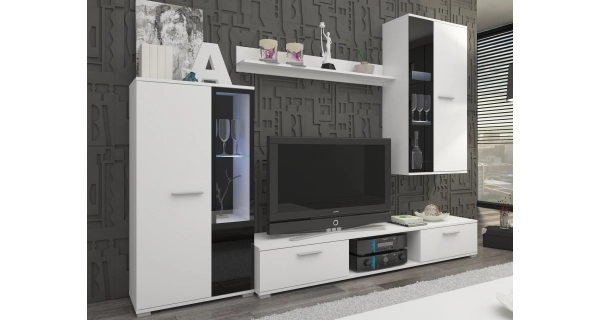 Obývací stěna v neutrálním bílém provedení s částečnými černými prvky Barevné provedení: bílé Sestava se skládá z (rozměry šxvxh): * TV stolek s výklopy (176 x 30 x 40,2 cm) * Vitrína (59,3 x 115 x