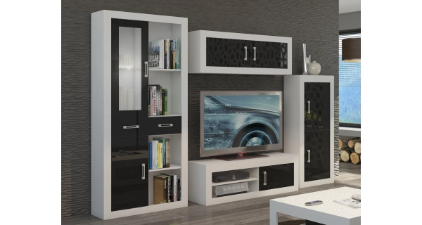 Obývací stěna GOUDINI 8, bílá/černý lesk, 5 let záruka
