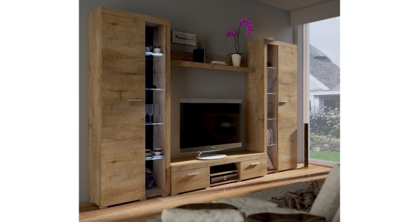 Obývací stěna Barva: dub lefkas Sestava se skládá z (rozměry šxvxh): * TV stolek (150 x 31,5 x 40,3 cm) * Vitrína (75 x 190 x 33,9 cm) - 2 ks * Police (150 x 16 x 17,6 cm) Celková šířka obývací stěny: