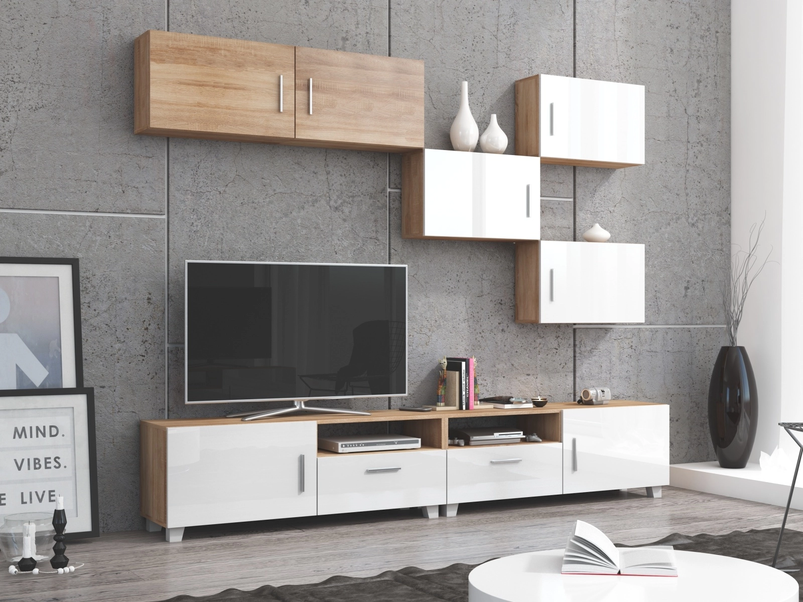 Obývací stěna KAMALI, dub sonoma/bílý lesk