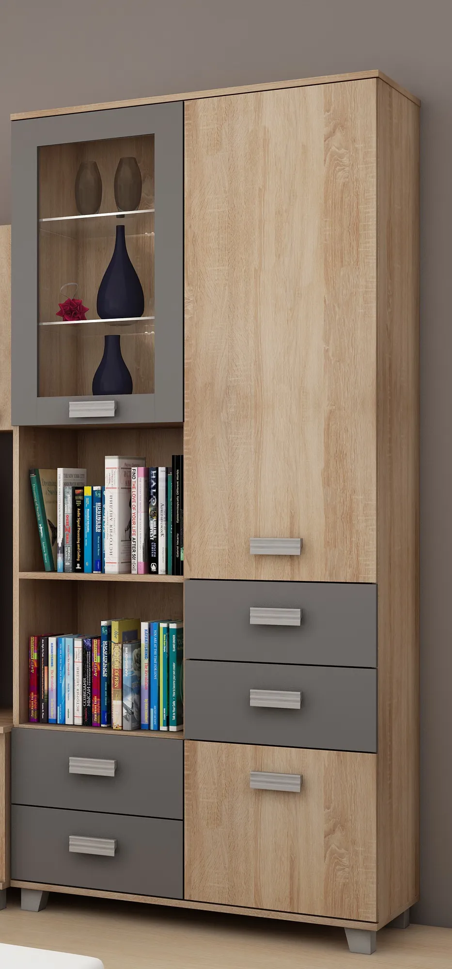 Obývací stěna Barva: dub sonoma/grafit Materiál: lamino 16 mm Součástí sestavy je (rozměry šxvxhl): * regál (90 x 200 x 42 cm) * RTV stolek (120 x 47 x 47 cm) * skříň (80 x 200 x 54 cm)
