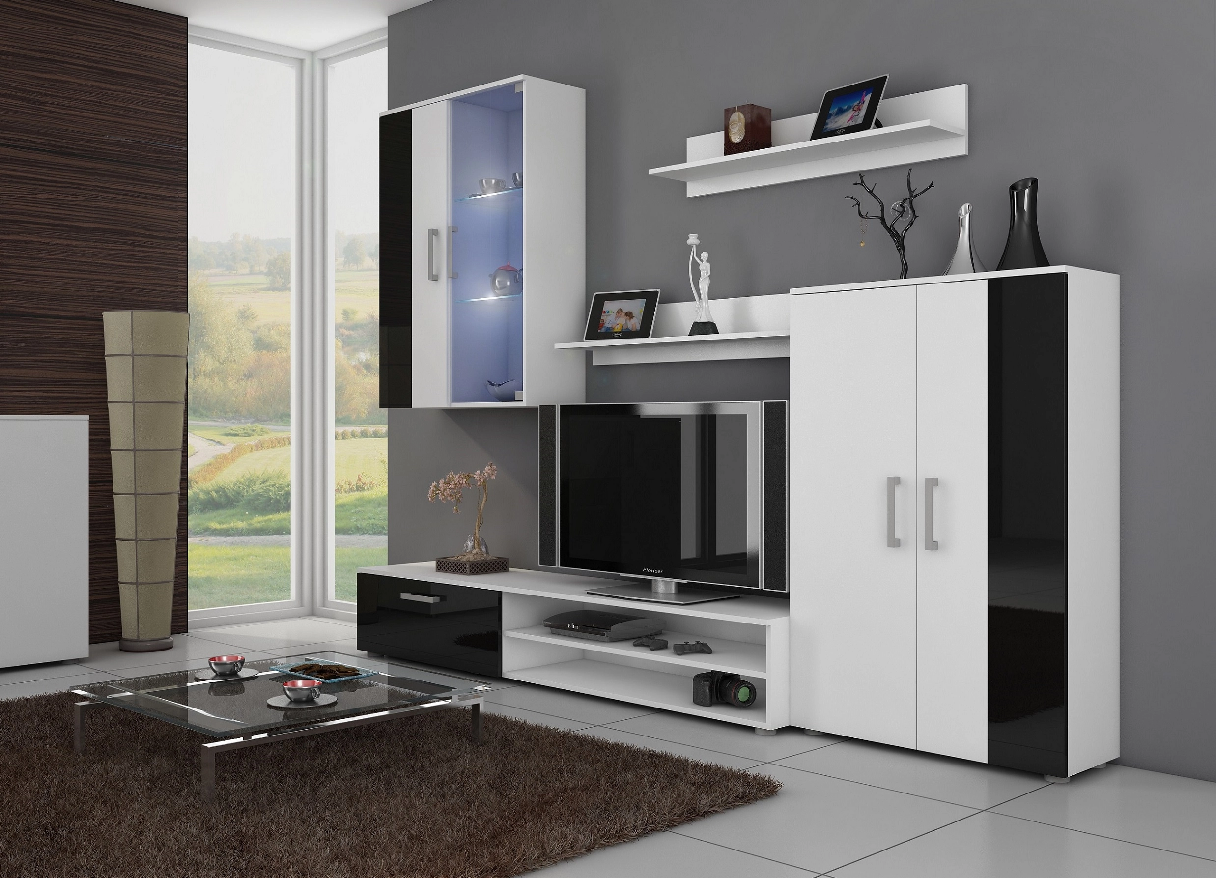 Obývací stěna MANGONA, bílá/černý lesk, 5 let záruka