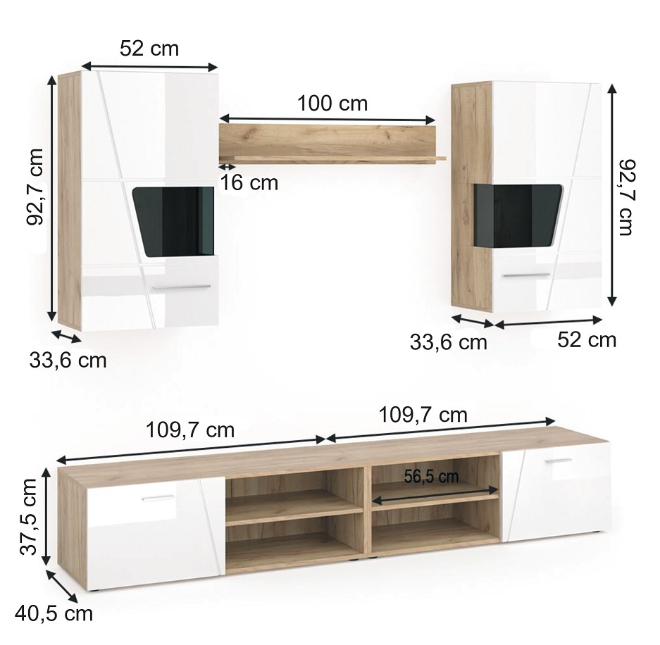 - TV stolek pravý – 109,7 x 41,7 x 33,9 cm Nožky a úchytky jsou z plastu. Fotografie obývací stěny s rozměry je pouze ilustrační! Dodáváno v demontu.
