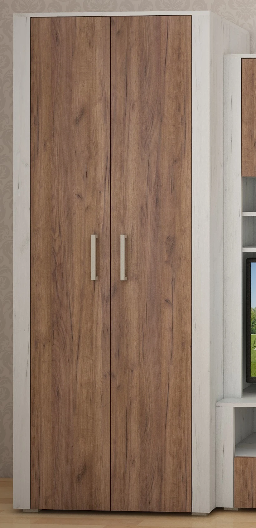 Obývací stěna Barva (korpus/dvířka/boční lišty): craft bílý/craf tobaco/craft bílý Materiál: lamino 26 mm Součástí obývací stěny je (rozměry šxvxhl): * úzká skříň (50 x 205 x 56 cm) * regál