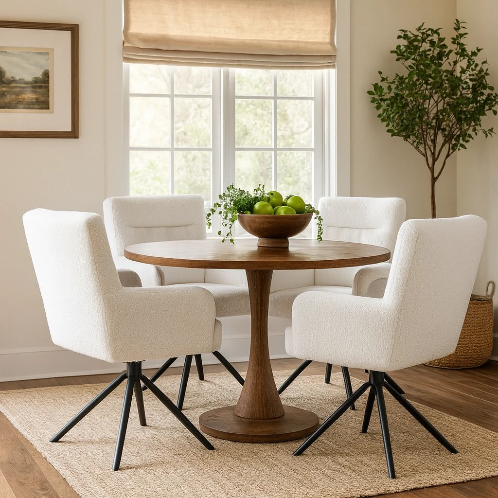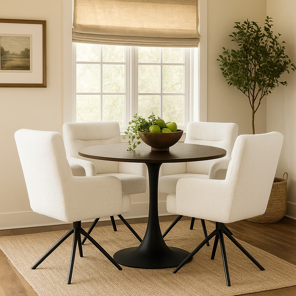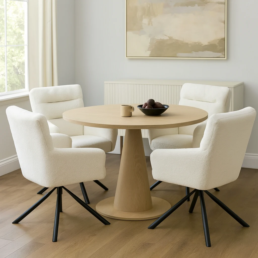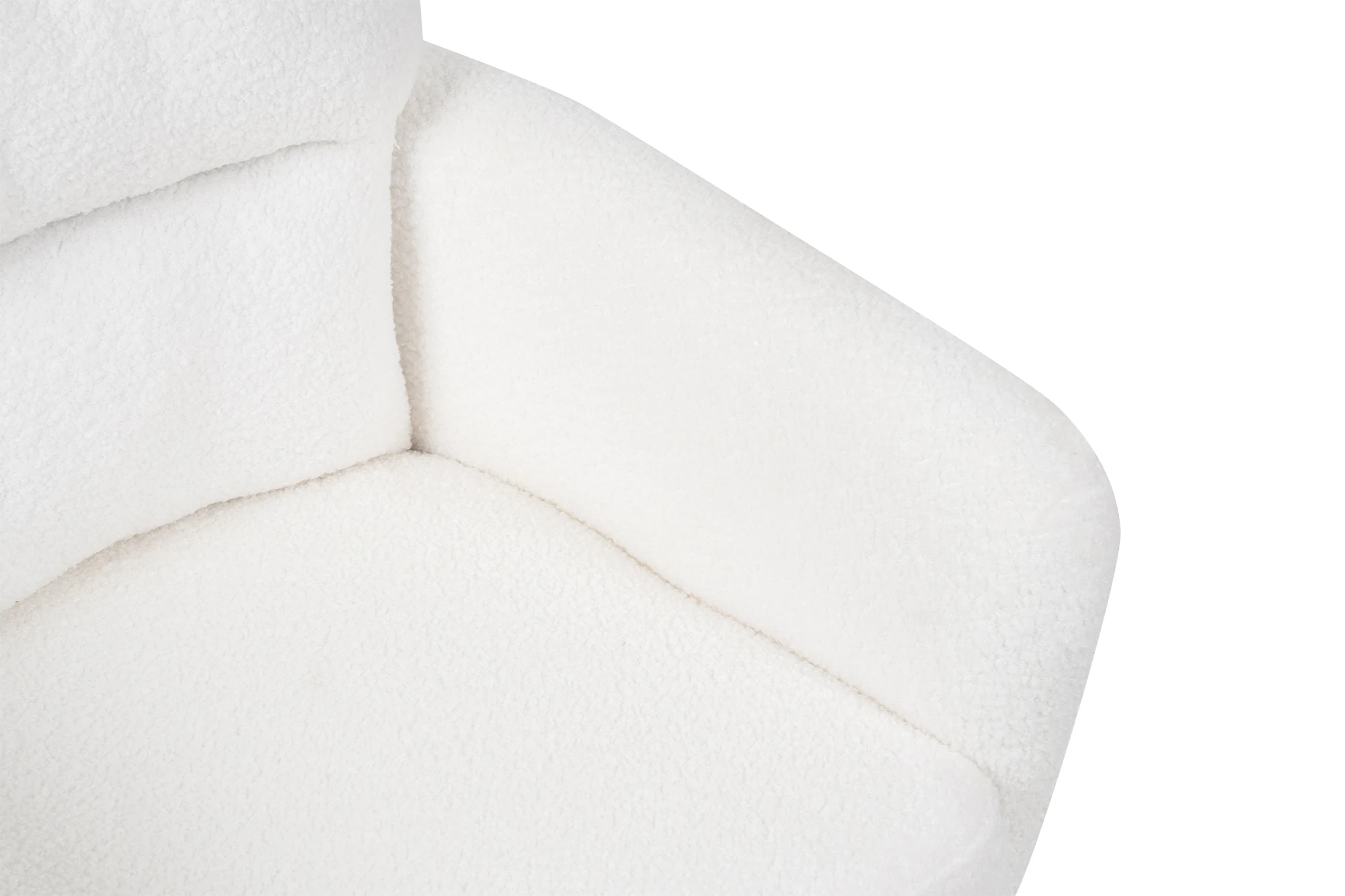 Moderní otočná židle s područkami a elegantním vzhledem. Pohodlné čalounění v bílé látce s měkkým povrchem. Stabilní kovová podnož s otočnou funkcí o 360°. Skvěle se hodí do jídelny, pracovny i kanceláře. Spojuje komfort, luxusní design a nadčasovou eleganci.