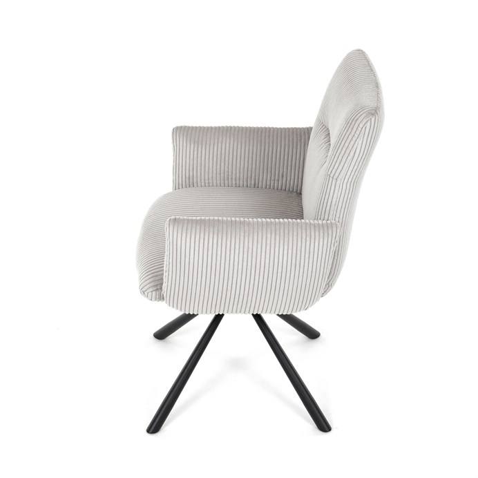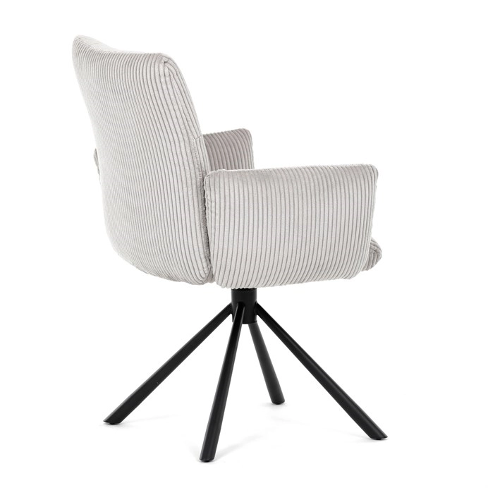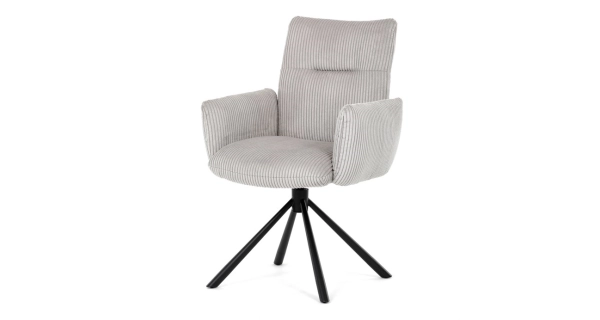 Stylová jídelní židle v moderním designu nabízí nejen pohodlí, ale i funkčnost. Měkké čalounění z manšestrové látky v kombinaci s výplní z PU pěny zajišťuje maximální komfort při sezení. Praktické područky a otočný mechanismus 360° umožňují volnost pohybu a pohodlné používání. Stabilní kovová základna v černé barvě dodává židli eleganci a zaručuje její odolnost. Tato židle je ideální volbou pro jídelny, které hledají spojení stylu a praktičnosti.