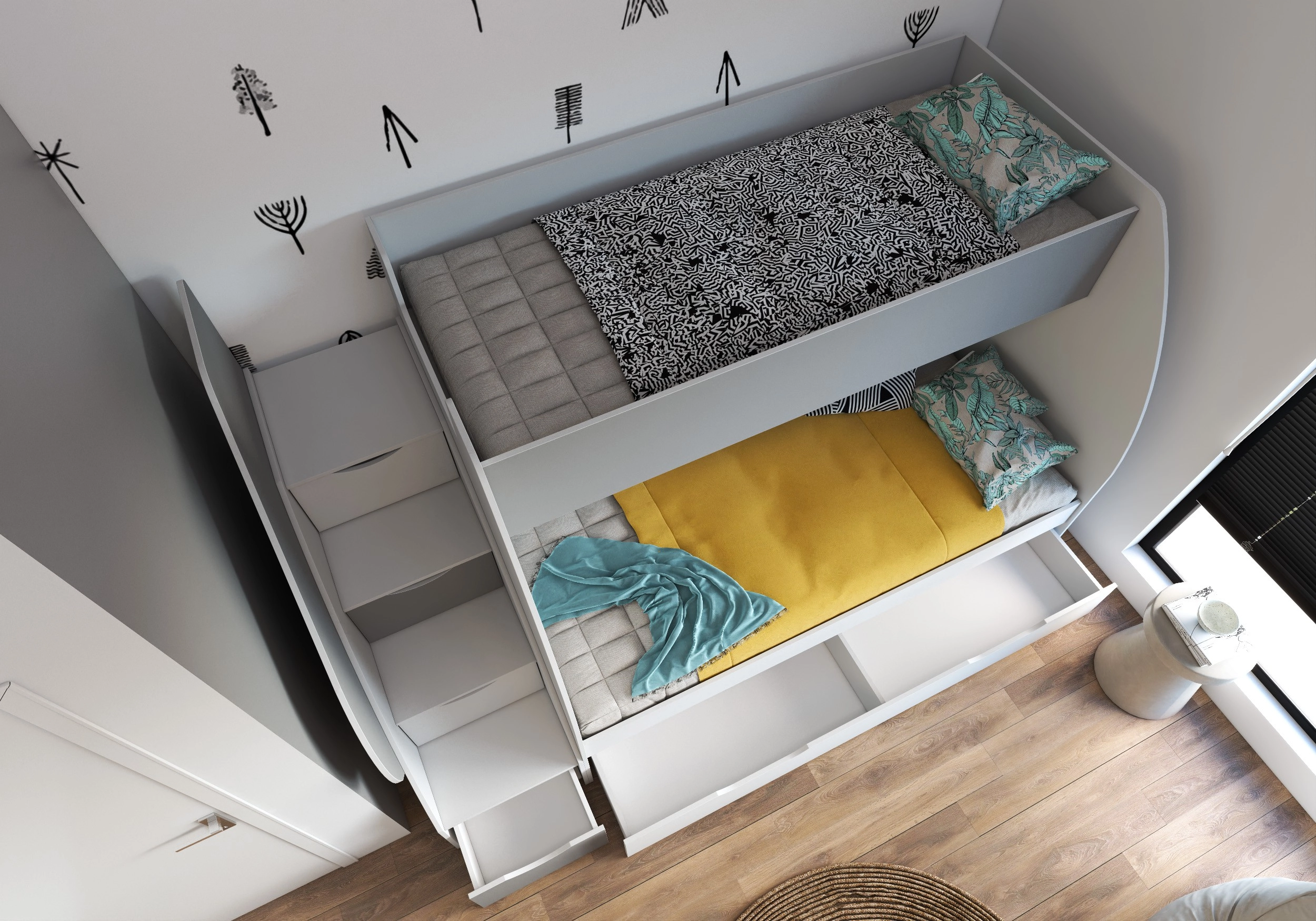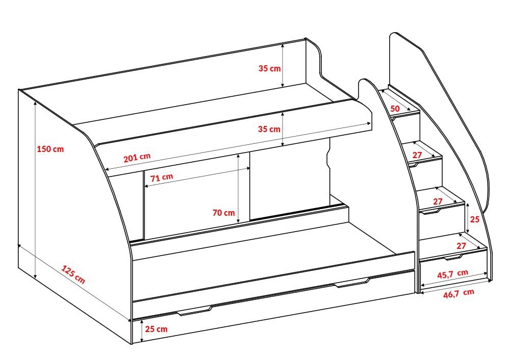 Patrová postel s úložným prostorem Postel má dvě spací místa s rozměry 80x200 cm Barva: bílá/šedá Rozměry (šxvxh): 255 x 150 x 125 cm Materiál: lamino o tloušťce 16 mm s ABS hranami - v každém schůdku se nachází prostorná zásuvka - schůdky lze namontovat na levou či pravou stranu - spodní lůžko je vybaveno úložným prostorem - postel je vhodná pro děti od 6ti let - posuvná čela, za nimiž jsou prostorné police - v ceně postele nejsou matrace, nutno je dokoupit Dodáváno v demontu