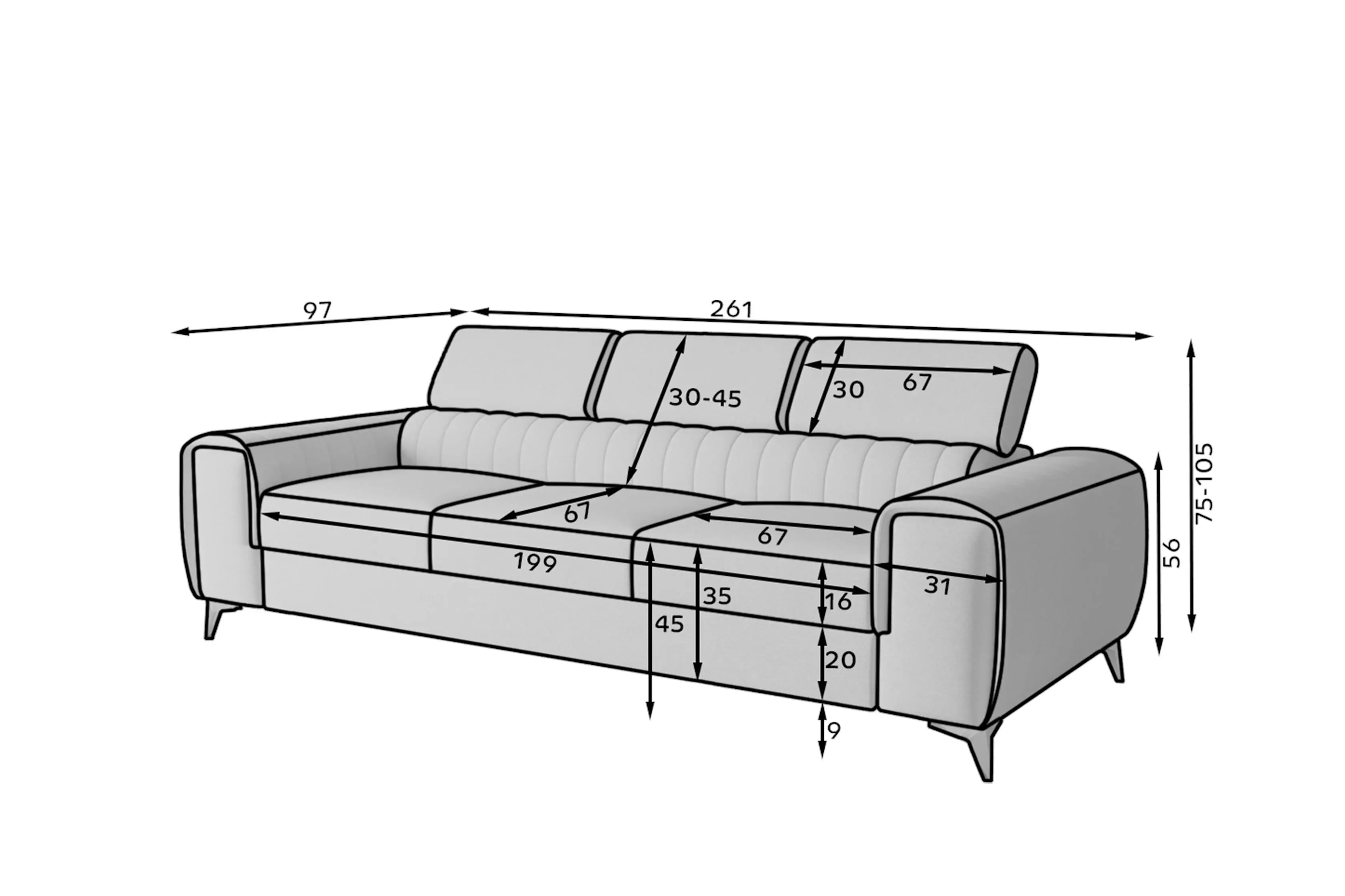 Rozměry (šířka x hloubka x výška): 261 x 97 x 105 cm, výška bez polštářů 75 cm, výška sedu 45 cm, hloubka sedu 67 cm