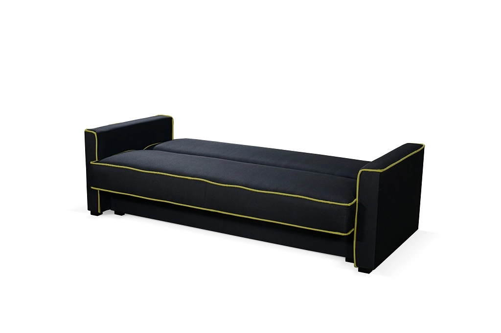 Obrázek úložného prostoru je pouze ilustrativní (jiná barva)! Potahová látka: Mura 100 = černá látka. Lemy obšité zelenou látkou Mura 35. Materiál: pružiny bonell, polyuretanová pěna T25 Rozměry (dxšxv): 215 x 86 x 90 cm Výška sedu: 44 cm Hloubka sedu: 52 cm Prostor pro spaní: 193 x 115 cm Rozměry úložného prostoru: 168 x 73 cm Nohy dřevěné.