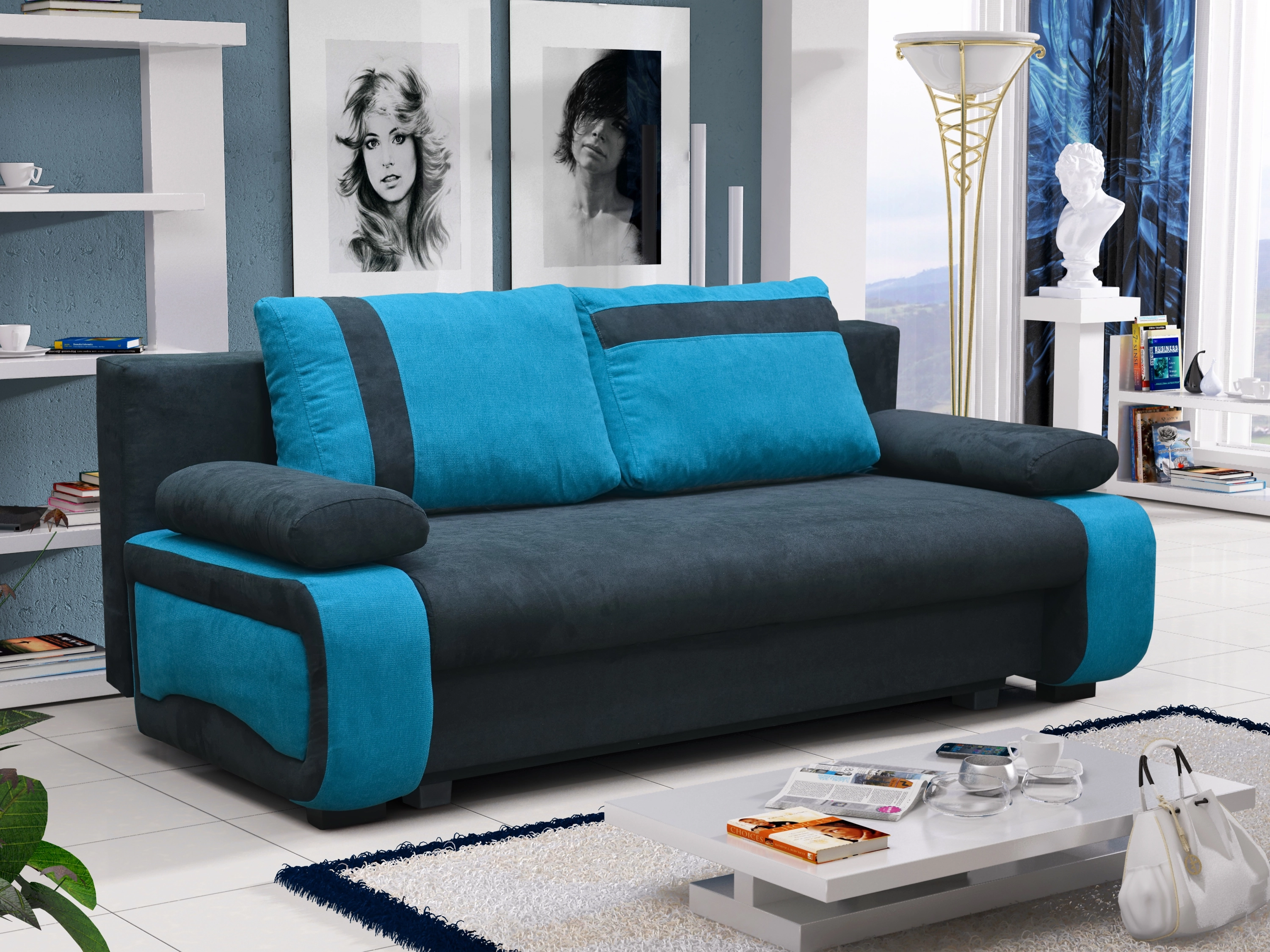 Rozkládací pohovka Potahová látka: Cosmic 100 = černá látka / Cosmic 190 = modrá látka Obrázek rozložené sedačky je ilustrativní (jiná barva)! Materiál: pružiny bonell, polyuretanová pěna T25 Rozměry (dxšxv): 196 x 100 x 87 cm. Výška bez poštářů: 75 cm. Výška sedu: 45 cm Hloubka sedu: 54 cm k polštářům, 83 cm bez polštářů Prostor pro spaní: 196 x 142 cm Rozměry úložného prostoru: 140 x 61 cm Záruka 24 měsíců.