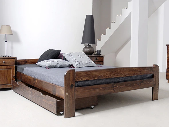 Postel 160x200 cm Materiál: masiv borovice, moření - ořech, tloušťka 2,6 cm Postel je ručně barvená, následně lakovaná, broušená a opět lakovaná. Postel má doplňující výztužnou desku, kde je umístěna