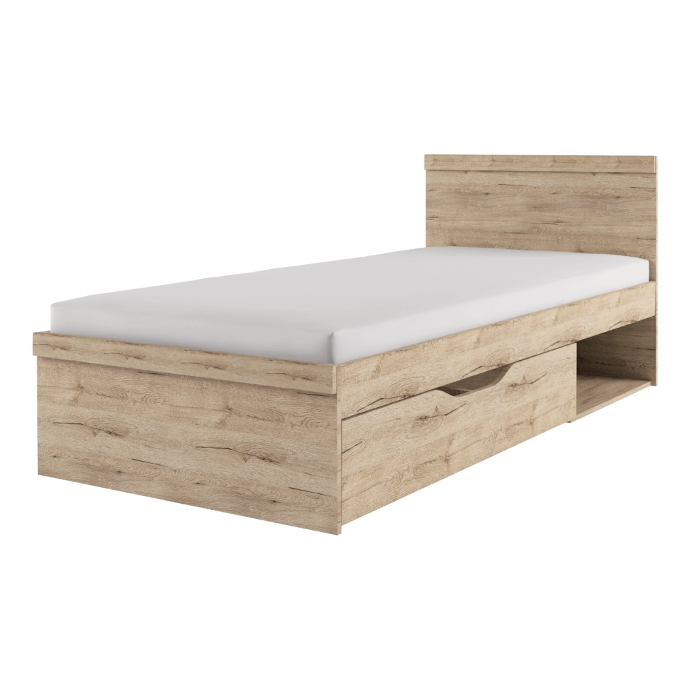 Postel se vyznačuje jednoduchým designem, nad který byla povýšena praktičnost a pohodlnost. Oceníte úložný prostor v podobě šuplíku, který díky otvoru v čelní desce snadno vysunete a opět zasunete. Postel dodáváme s roštovou deskou. Doporučujeme dokoupit matraci s rozměrem 90 x 200 cm. Vyrobena je z DTD laminované, znakem kvality jsou i ABS hrany. V trendovém provedení dub sanremo.