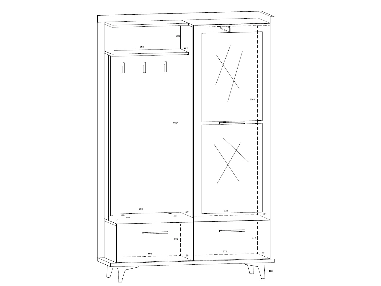 Předsíň má dvoje výklopná dvířka, věšákovou část s poličkou, třemi háčky a část se zrcadlovými dveřmi, za kterými je výsuv na ramínka. Deska skříňky pod věšákovou částí je čalouněná černou ekokůží.