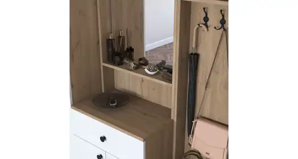 Předsíňová stěna Barva: vlašský ořech/bílá Materiál: melaminem potažená dřevotřísková deska - 18 mm Rozměry (šířka x výška x hloubka): 179,4 x 226,4 x 37,5 cm Dodáváno v demontu.