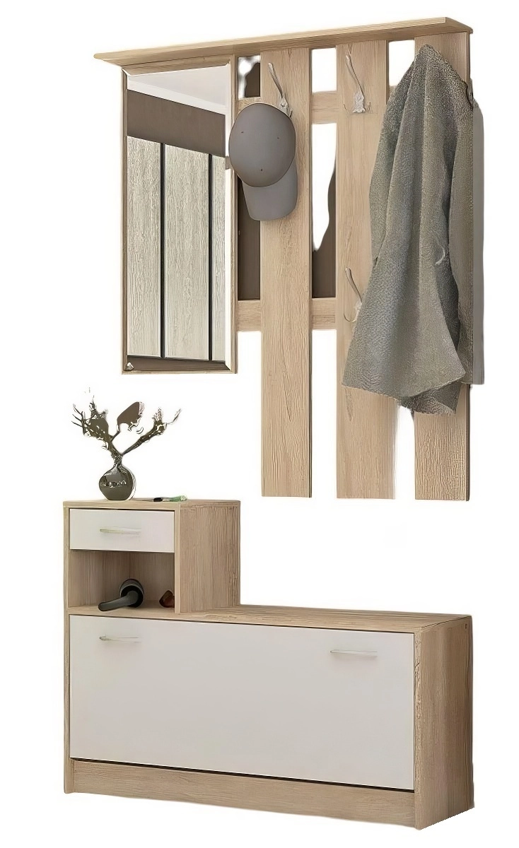 Moderní předsíňová stěna se zrcadlemKe stěně lze dokoupit skříň a podsedák viz příslušenství Materiál: LTD, skloÚchyty: plastBarva: dub sonoma/bílá Rozměry (šxvxh): 100 x 187 x 27,5 cm Dodáváno v demo