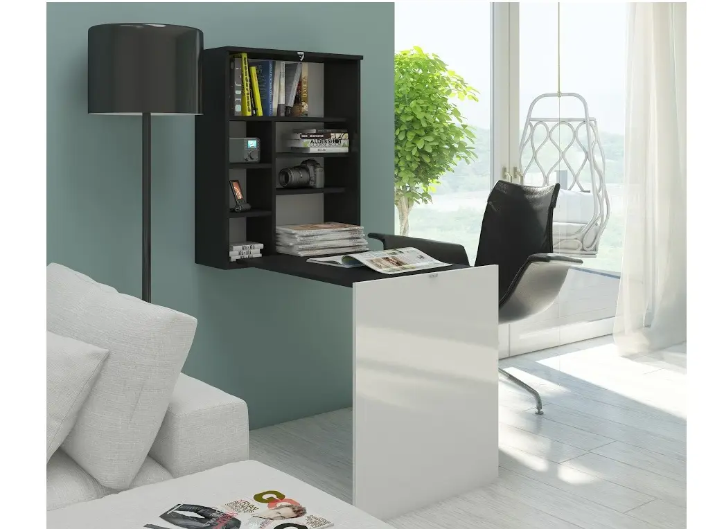 Moderní psací stůl Určený k připevnění na zeď. Rozkládací provedení je ideální do malých prostor. Barva: černá/bílý lesk Materiál: lamino 16 mm Rozměr (šxvxhl): 60 x 78/149 x 25/93 cm Dodává
