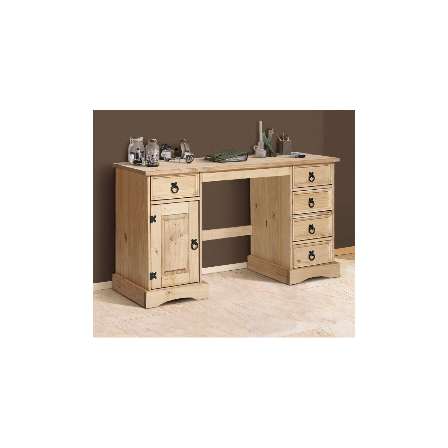 Psací stůl s úložným prostorem na obou stranách Materiál: masiv borovice Povrchová úprava - voskované v medovém odstínu Rozměry (šxvxh): 140 x 76 x 48 cm 5 malých zásuvek, 1 dvířka, kovové zdobené úchyty
