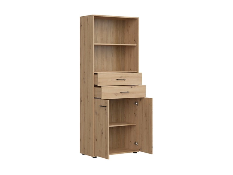 Regál Dvířka mají systém tichého dovírání a černé, tenké úchyty pro snadnější manipulaci při otevírání. Úložný prostor je v podobě police uschované za dvířky a dvou dlouhých zásuvek s tichým dojezdem. Výhoda - možnost umístit otevřený díl do spodní části. Materiál: lamino Barva: dub artisan Rozměry (šxvxh): 80 x 202,5 x 37 cm