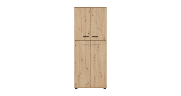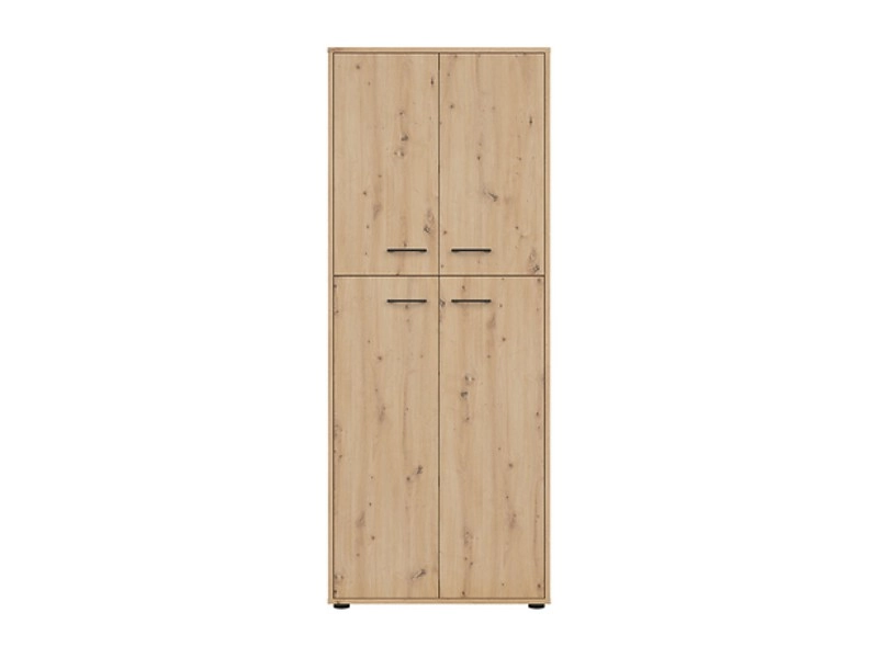 Regál - dvířka mají tiché dovírání a černé tenké úchyty pro snadnější manipulaci při otevírání - úložný prostor je v podobě polic Regál je rozdělený na dva díly - větší a menší část. Výhodou je možnost vybrat si, zda bude menší část nahoře, nebo dole. Materiál: lamino Barva: dub artisan Rozměry (šxvxh): 80 x 202,5 x 37 cm