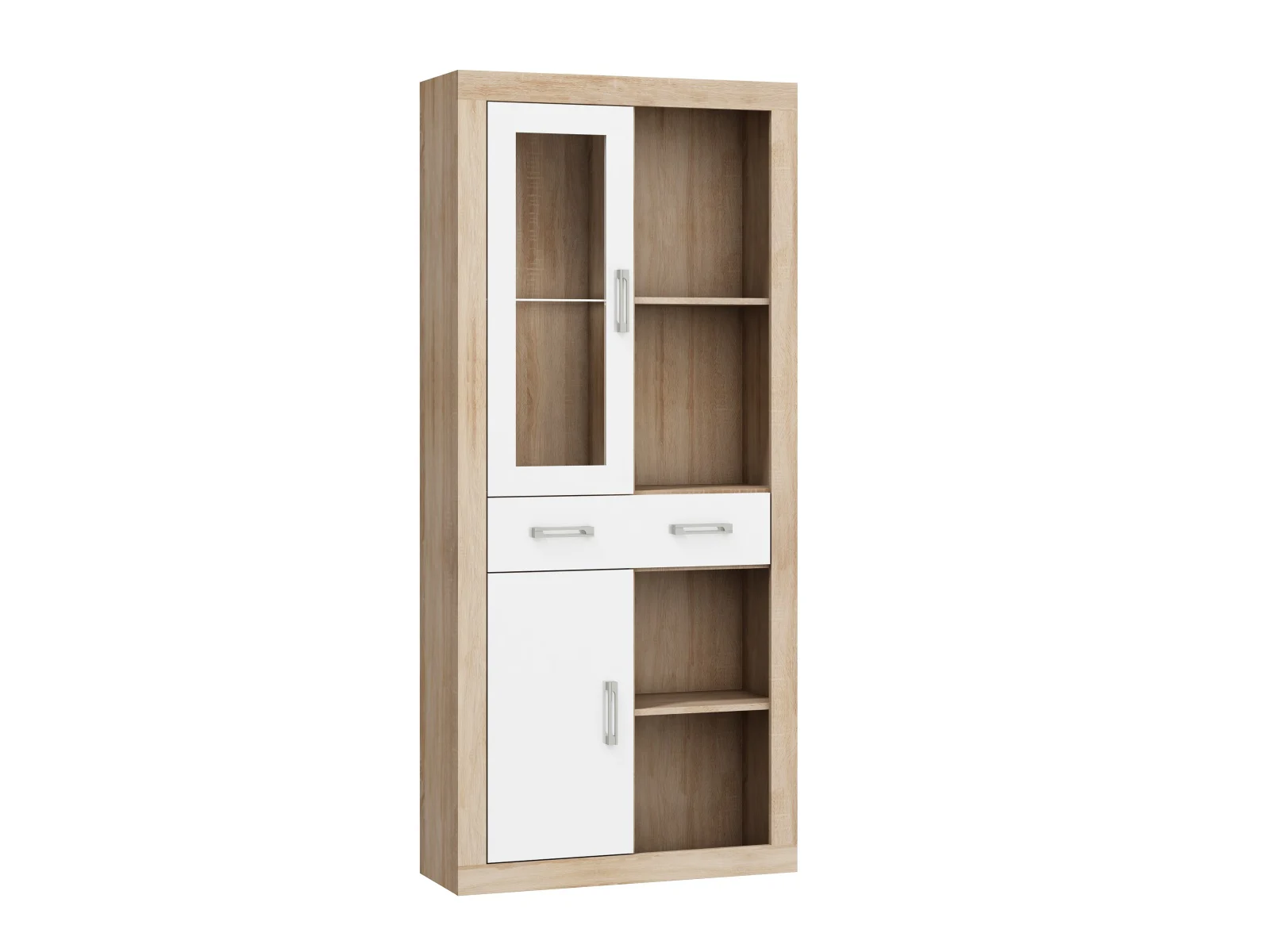 Policový regál se šuplíkem Barva: dub sonoma (korpus)/bílý lesk (dvířka) Materiál: lamino 16 mm Rozměry (šxvxhl): 90 x 198 x 34 cm Dodává se v demontu.