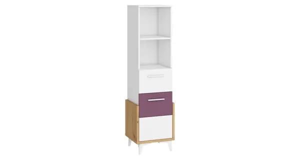 Regál je vybaven jednou zásuvkou a jedněmi dvířky. Barva: - dub artisan/bílá/fialová - nožky a úchytky: bílá Rozměr (šxvxh): 45 x 163 x 42 cm Výška nožek: 12 cm Materiál: lamino - korpusy mají