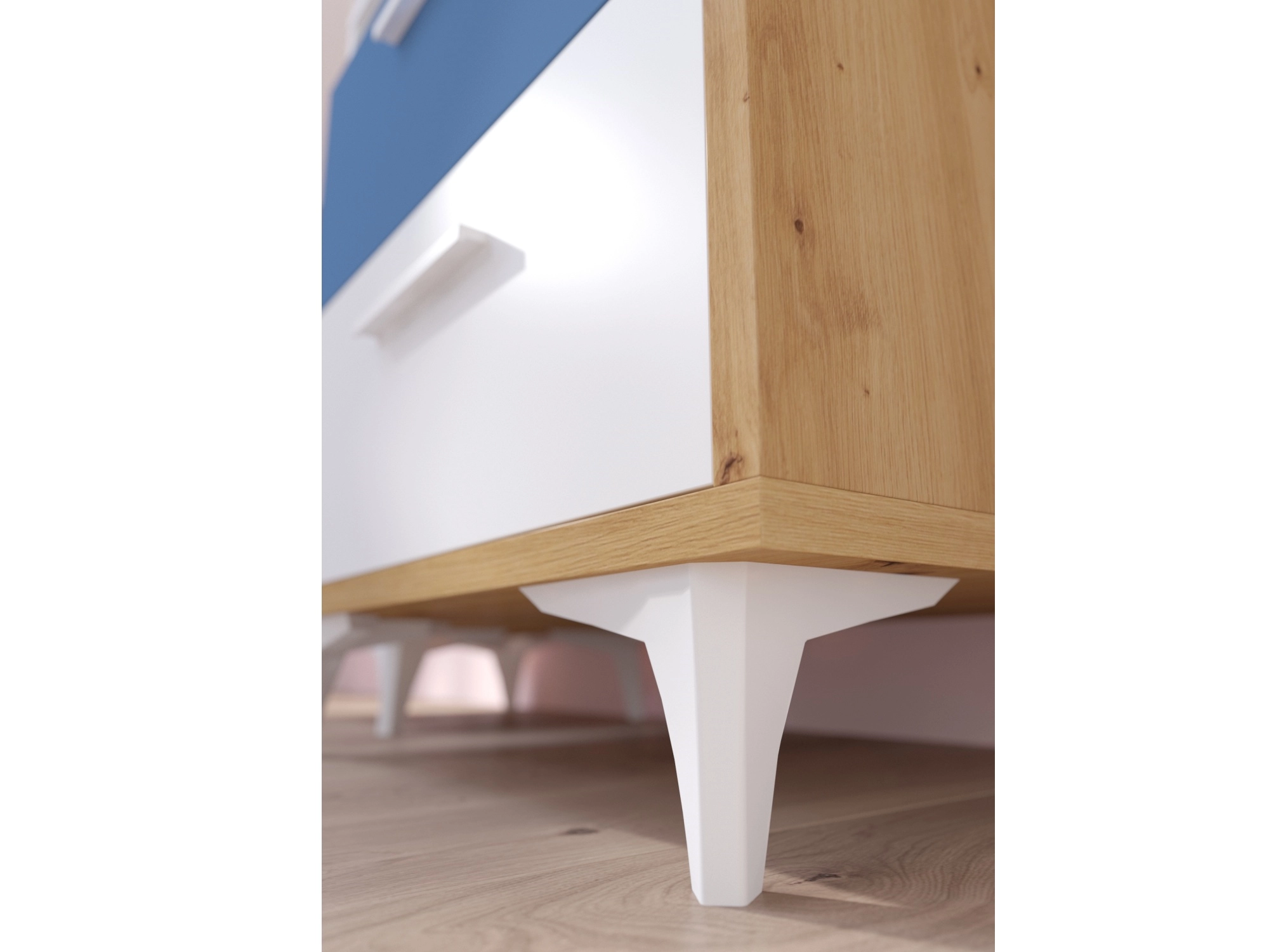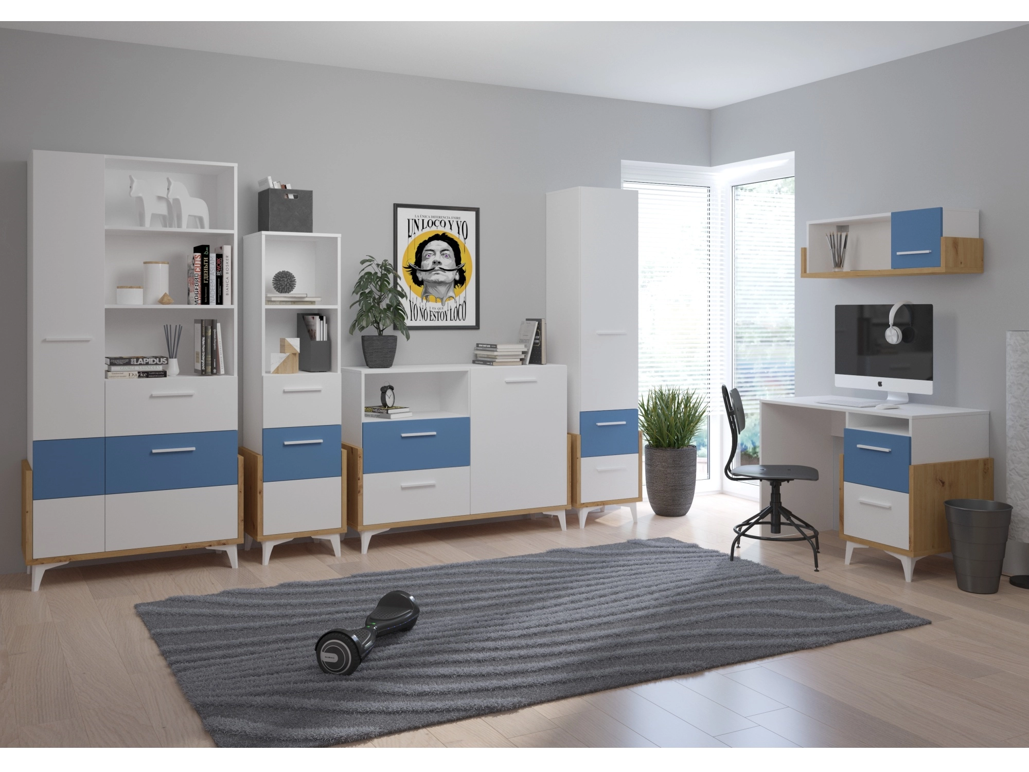 Regál je vybavený jednou zásuvkou, dvěma skříňkami (pod zásuvkou uvnitř jedna police, po straně uvnitř čtyři police) a třemi policovými prostory.
