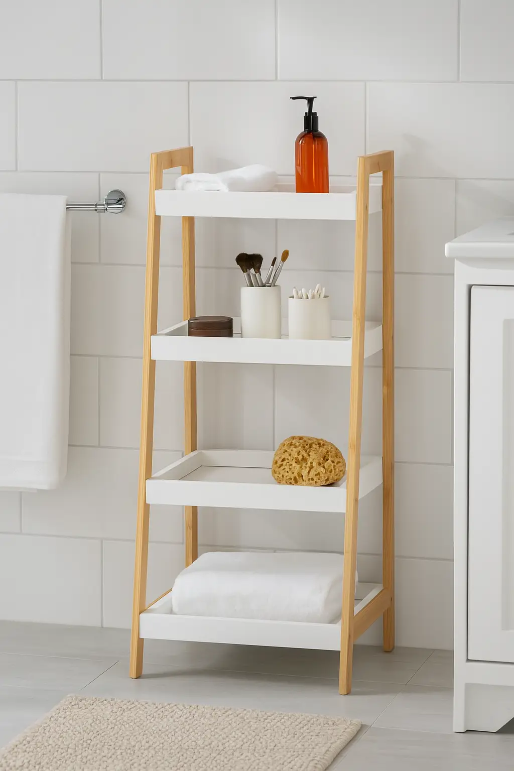 Designový policový regál se čtyřmi hlubšími policemi ve tvaru táců. Rám z přírodního bambusu dodává stabilitu a moderní vzhled. Bílé police s vyvýšenými okraji brání předmětům vypadnutí. Praktické řešení pro uložení dekorací, knih, ručníků nebo rostlin. Díky zkosené konstrukci působí odlehčeně a zapadne do moderních interiérů. Vhodný do obývacího pokoje, koupelny, ložnice i předsíně.