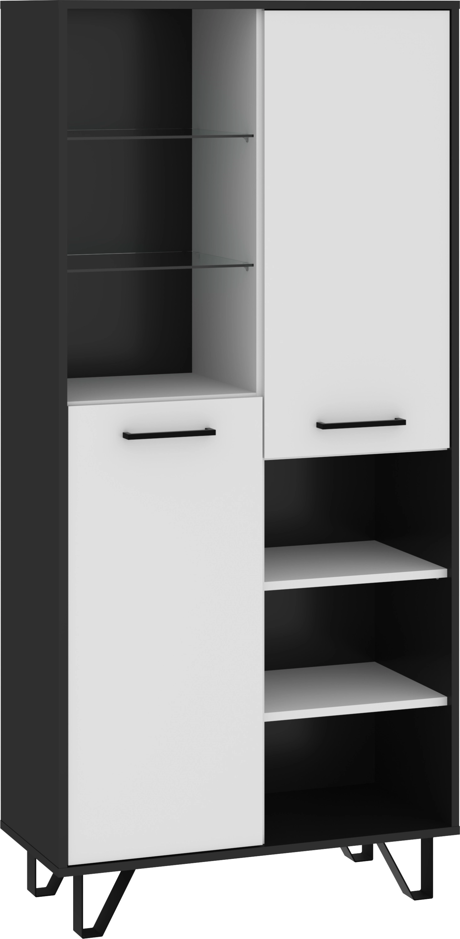 Policový regál Barva: - černá/bílý lesk - nožky a úchytky: černá Rozměr (šxvxh): 80 x 170 x 39 cm Výška nožek: 12 cm Materiál: - lamino 16 mm, ABS hrany- 2 police: sklo - nožky: kov Nosnost: - police: