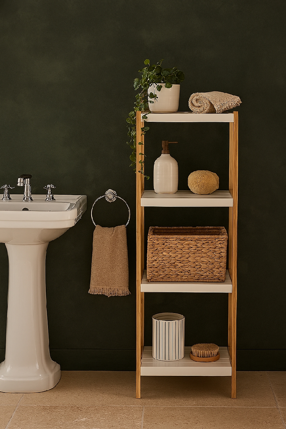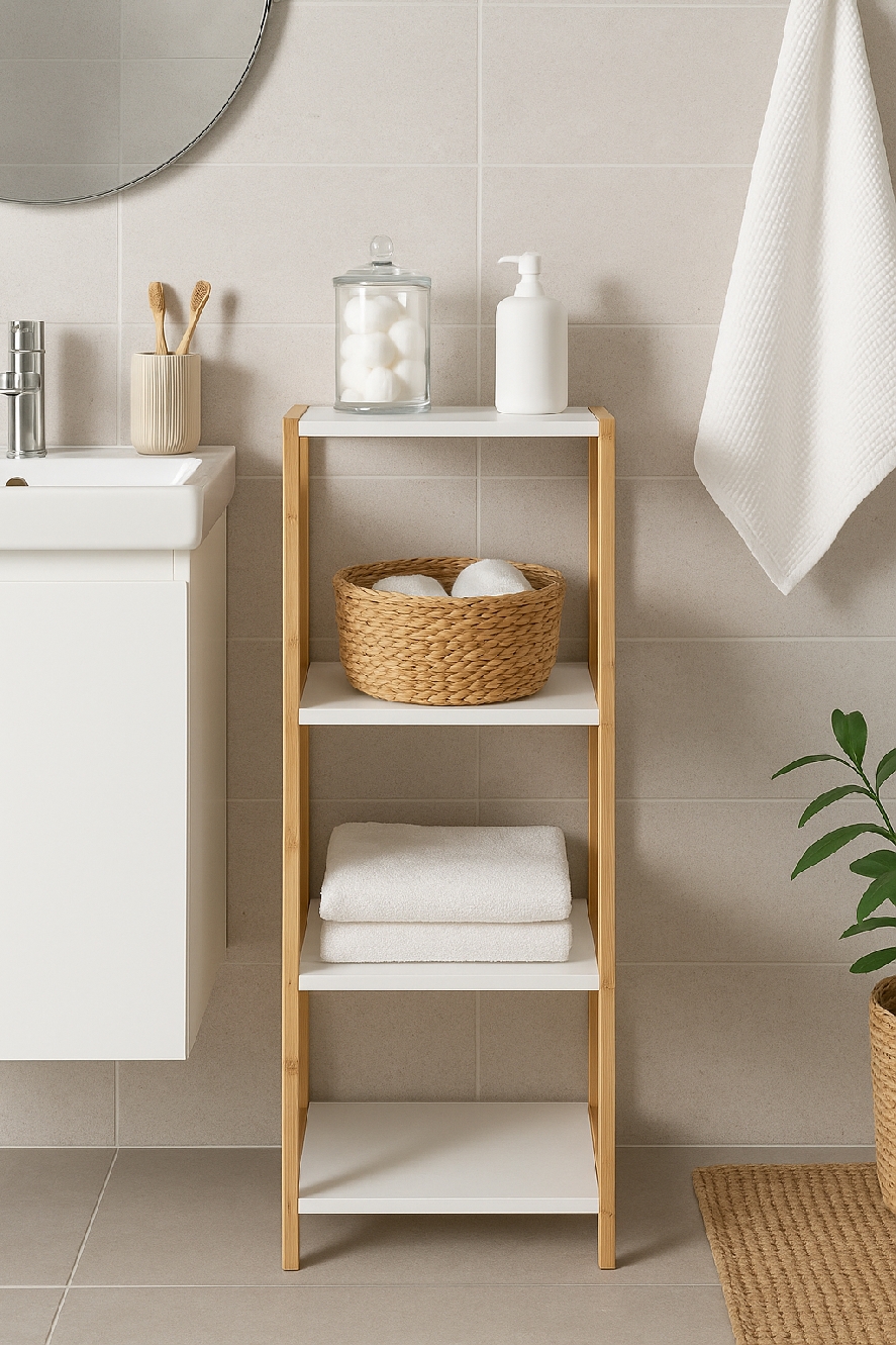 Moderní policový regál se čtyřmi úložnými policemi. Kombinace přírodního bambusového rámu a bílých polic působí elegantně a vzdušně. Stabilní konstrukce vhodná pro každodenní používání. Praktické využití pro uložení ručníků, kosmetiky, knih nebo dekorací. Hodí se do koupelny, ložnice, obývacího pokoje i předsíně. Jednoduchý design, který snadno zapadne do různých interiérů.