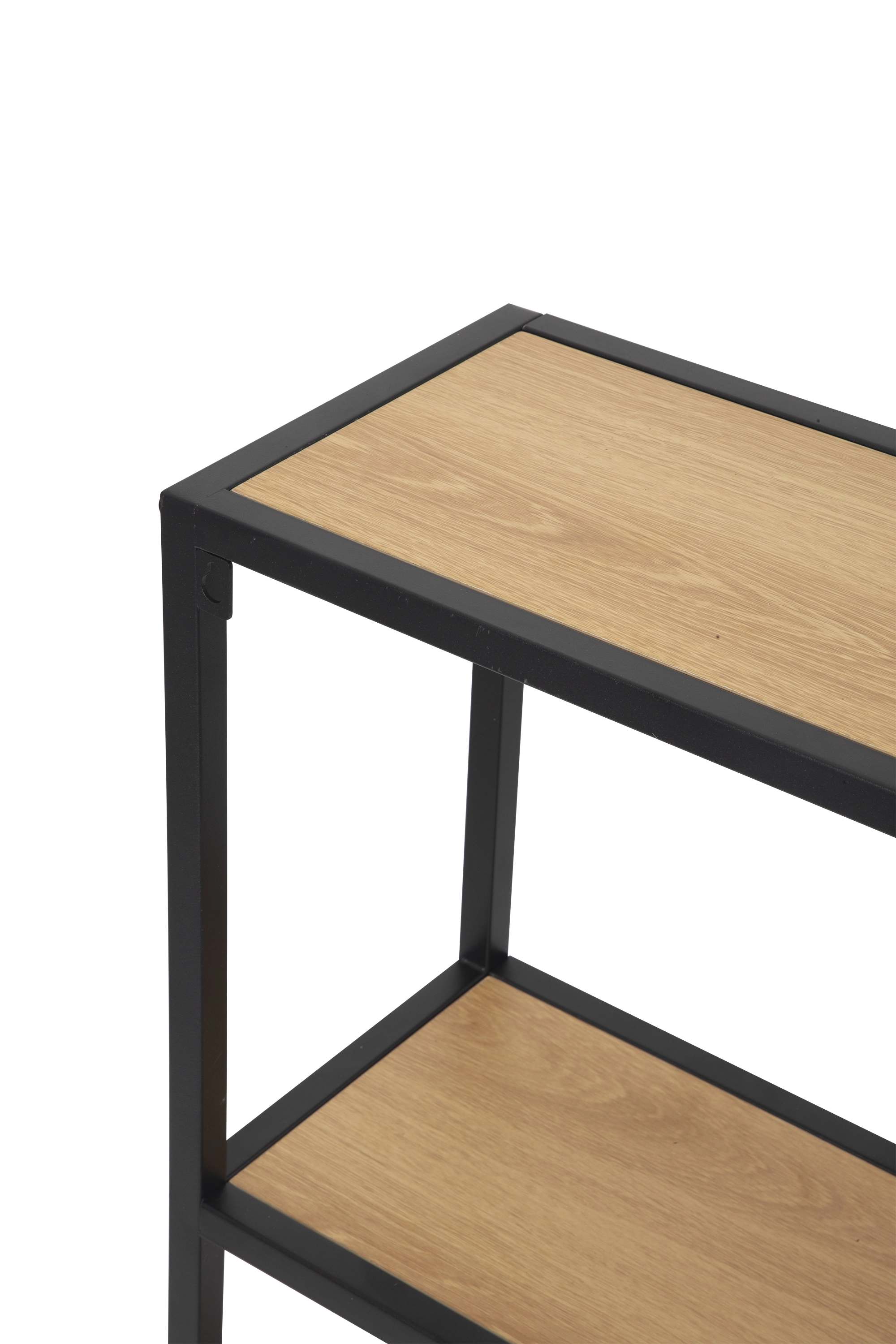 Černá kovová konstrukce zajišťuje stabilitu, zatímco laminované police jsou snadno udržovatelné a odolné vůči běžnému používání. Regál se hodí do obývacího pokoje, pracovny nebo vstupního prostoru.