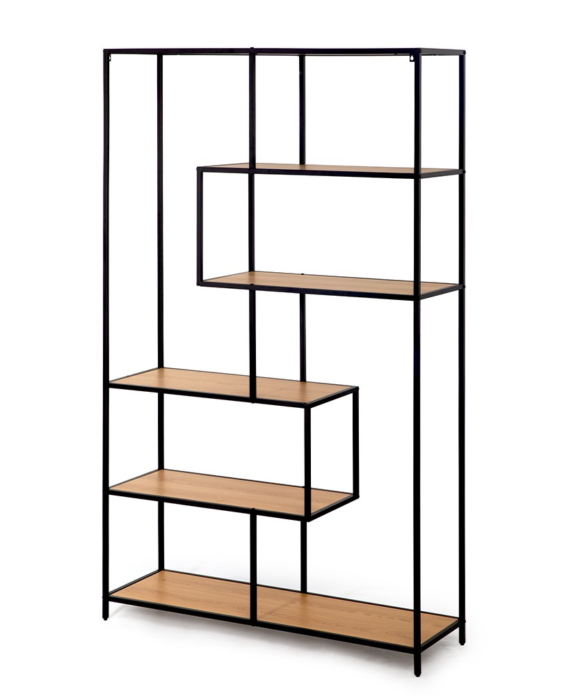 Moderní policový regál s originálním asymetrickým designem. Police v dekoru přírodního dřeva dodávají interiéru teplý vzhled. Stabilní kovová konstrukce v černém provedení. Ideální na knihy, dekorace či drobné předměty. Spojuje praktičnost, vzdušnost a stylový industriální vzhled.