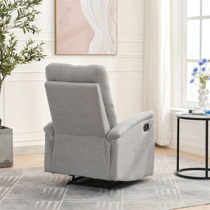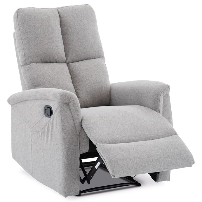 Polohovací křeslo, světle šedé barvy, s manuálním ovládáním. Toto komfortní křeslo je vybaveno postranní pákou, která umožňuje snadné nastavení sklonu zadní opěrky a zvednutí podnožky.