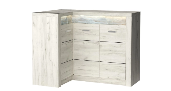 Rohová komoda Tento sektorový systém je exkluzivní kolekce navržena v moderním duchu. Celá řada se vyznačuje elegancí a jednoduchými tvary, které zaručují plné využití prostoru. Za dvířky se nachází 1 police, roh vlevo. Materiál: kvalitní lamino s ABS hrany ( 0,5-0,8 mm ), úchyty - kov Barevné provedení: jasan bílý Rozměry (šířka x hloubka x výška): 90/131 x 42 x 103,5 cm Dodáváme v demontovaném stavu.