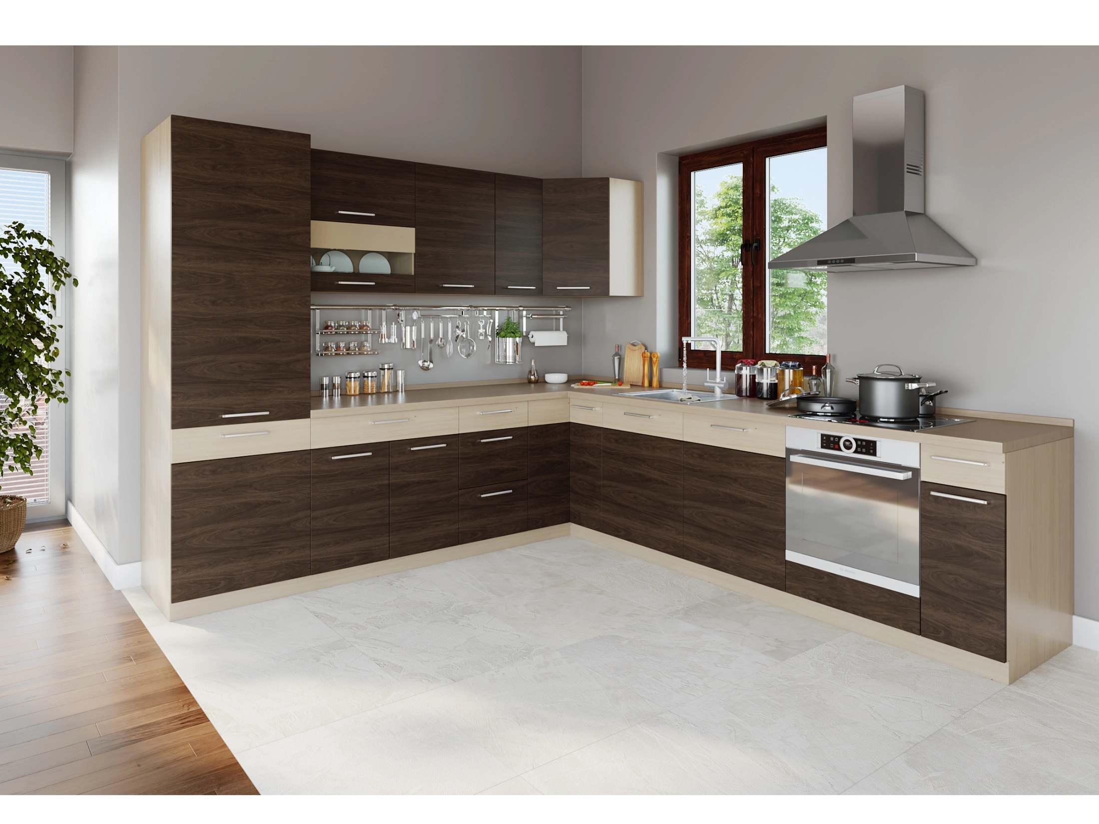 Rohová kuchyňská sestava Rohová kuchyně o rozměru 275x300 cm - jedná se jen o jednu z možných sestav, možno dokoupit další skříňky nebo celou kuchyni sestavit dle svých představ - viz zařazení produktu. Barva: korpus - rijeka světlá, dvířka - rijeka tmavá/rijeka světlá Rozměry: - dolní skříňky: výška 82 cm, hloubka 50 cm, šířky: 60 cm - dolní dřezová skříňka D60Z 82 cm - dolní rohová skříňka D90NW 45 cm - dolní skříňka D45S3 30 cm - dolní skříňka D30S1 80 cm - dolní skříňka D80S1 60 cm - dolní skříňka na vestavnou troubu D60P 60 cm - potravinová skříň D60C 60 cm - dvířka na myčku