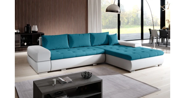 Rozkládací rohová sedačka Sedačka je univerzální = roh lze smontovat na pravý i levý! Potahová látka: orinoco 85 = tyrkysová látka/madryt 120 = bílá ekokůže Součástí jsou polštáře a úložný prostor. Obrázek
