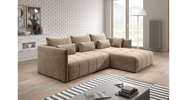 Součástí jsou polštáře se zapínáním na zip a úložný prostor. Celočalouněná, vhodná do prostoru.