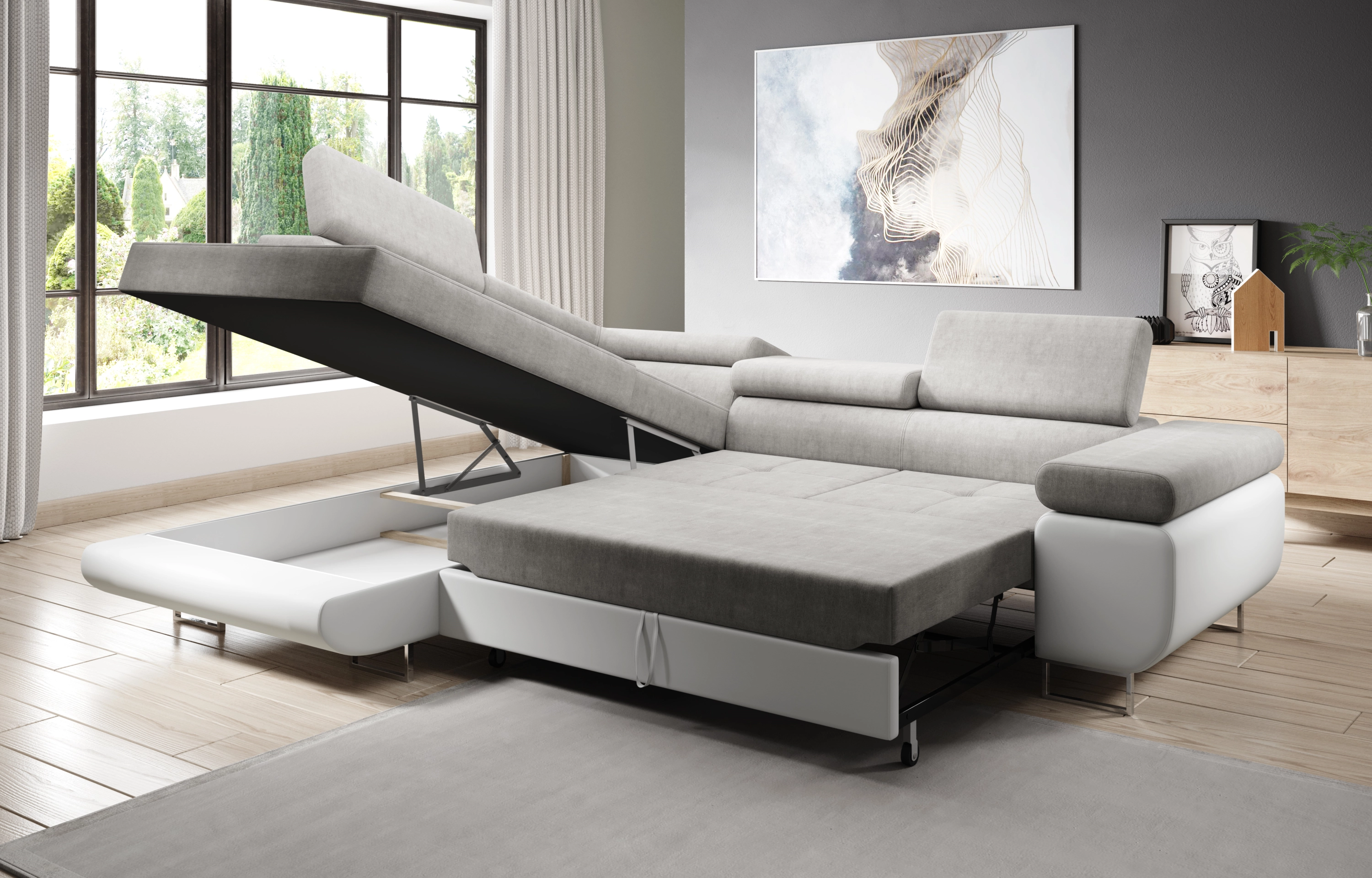 Sedačka má pevná záda se sklopným záhlavníkem a úložný prostor.