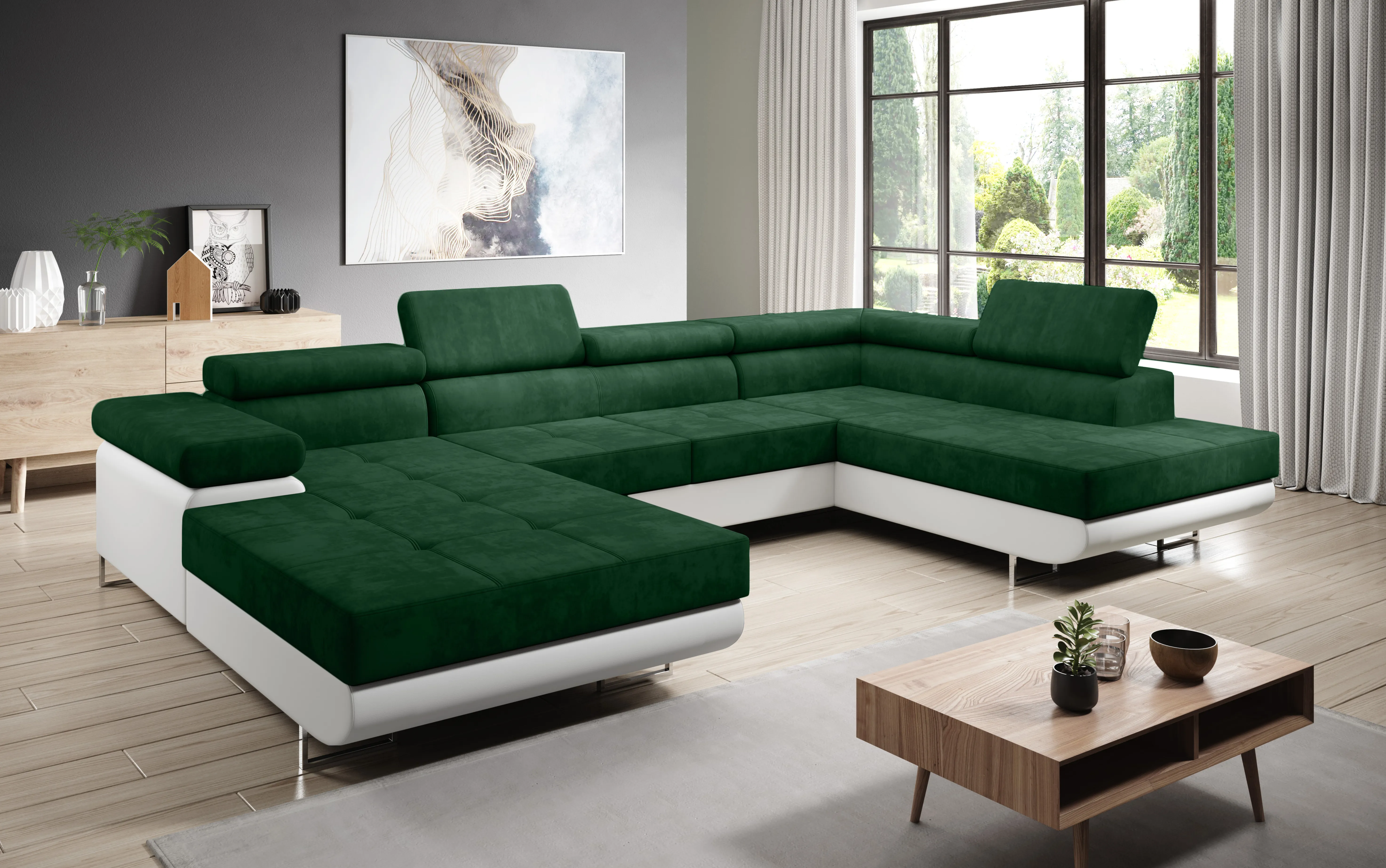 Rozkládací rohová sedačka, pravá Potahová látka: kronos 19 = zelená (smaragdová) látka/madryt 120 = bílá ekokůže Sedačka má pevná záda se sklopným záhlavníkem a 2 úložné prostory. Obrázek rozložené